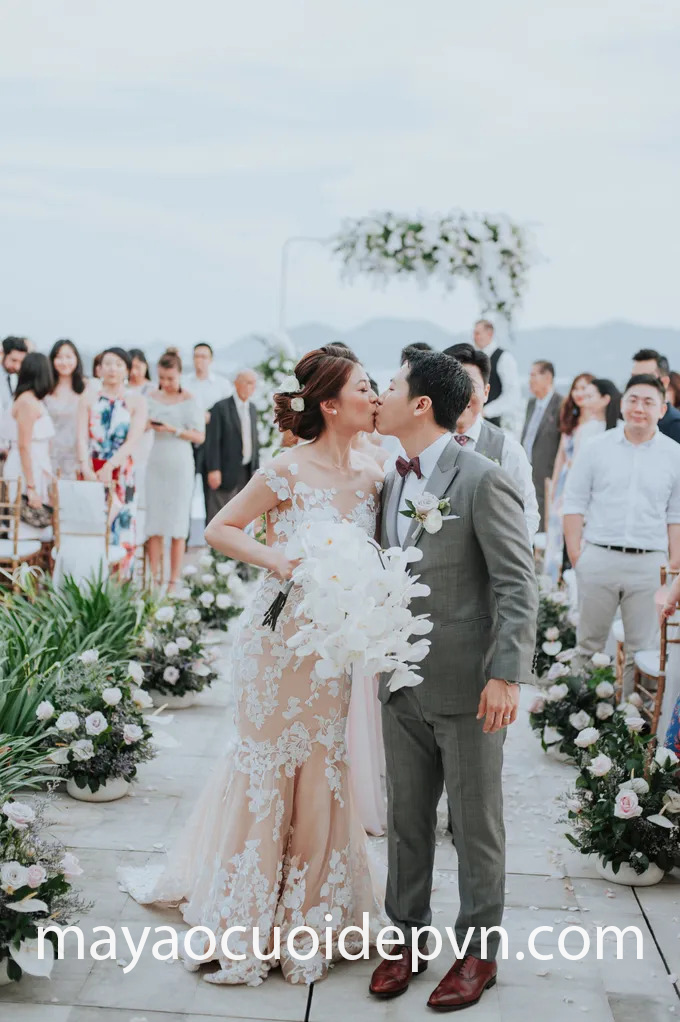 Sự phá cách tinh tế đến từ việc sắp đặt bố cục ren bất đối xứng trên thân áo, thắt lưng đính đá định vị vòng eo thon gọn và kết thúc bằng đuôi cá dài ấn tượng đã giúp cô dâu ghi điểm tuyệt đối trong hôn lễ thân mật.