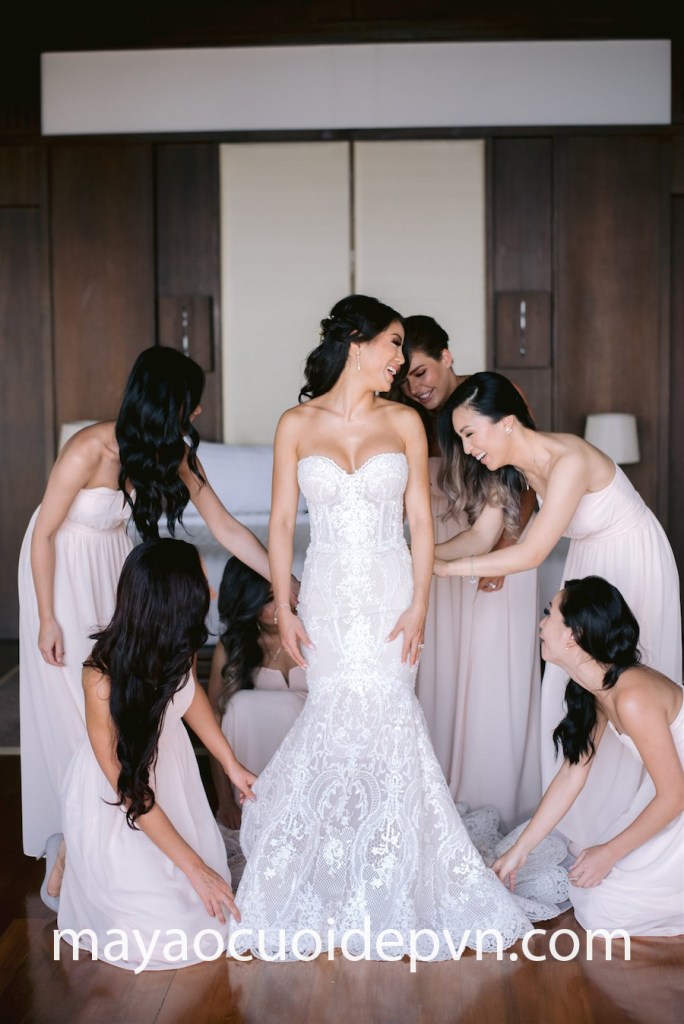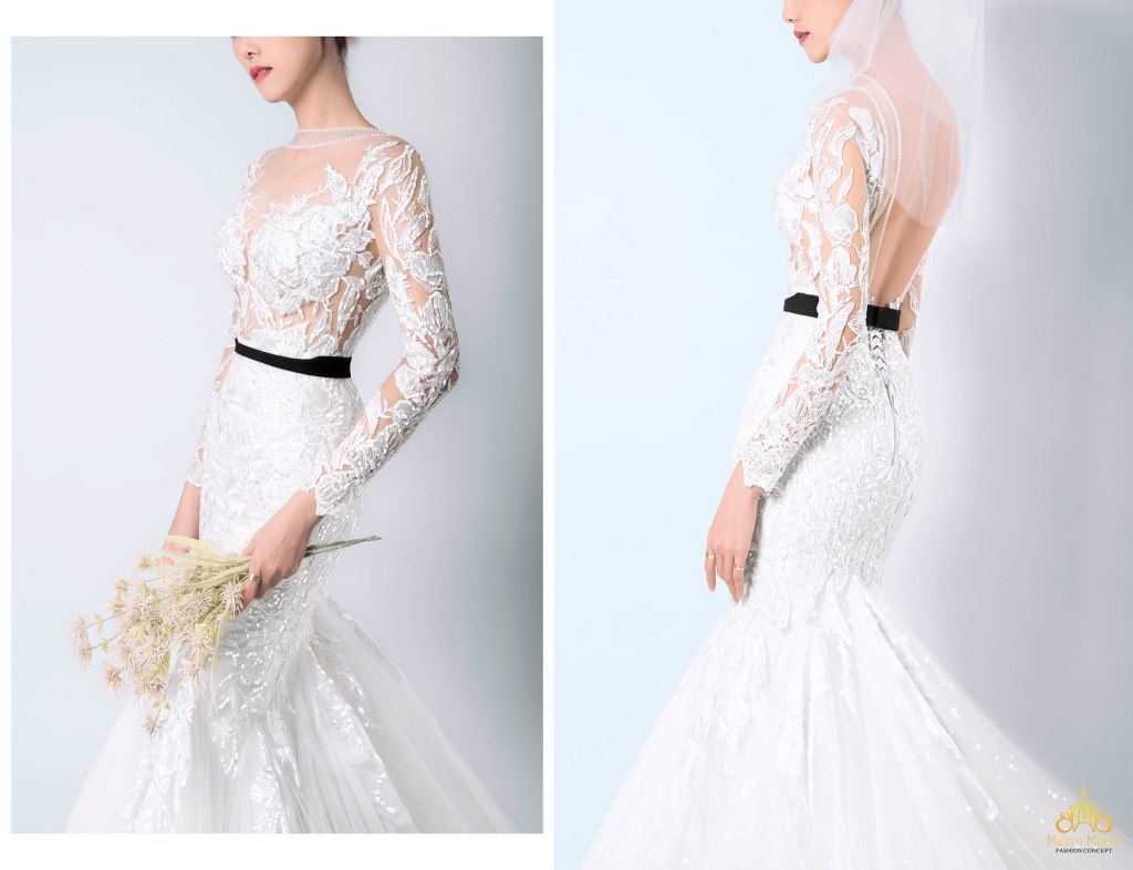 Bằng việc lựa chọn đặt may áo cưới đuôi cá, bạn hoàn toàn có thể tuy chỉnh váy cưới theo nhu cầu của bản thân như chọn kiểu cổ áo kín đáo thân trước, hở toàn bộ lưng phía sau hay sắp đặt bố cục ren tuỳ thích, hoặc đính kết trang trí thêm để chiếc váy cưới có thể khai thác tối đa vẻ đẹp của bạn.
