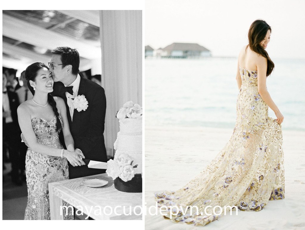 Trong đêm dạ tiệc cưới sang trọng hay tiệc thân mật trên biển, cô dâu có thể thoải mái lựa chọn cho mình kiểu đầm cưới đuôi cá dạ hội thiết kế riêng với form dáng ôm vừa phải nhưng vẫn đủ tôn dáng, giúp bạn dễ dàng hơn trong di chuyển. Toàn bộ váy cưới đính kết lấp lánh ánh bạc và vàng trên nền vải xuyên thấu gợi cảm, rất hoàn hảo cho chủ đề đám cưới dạ tiệc.