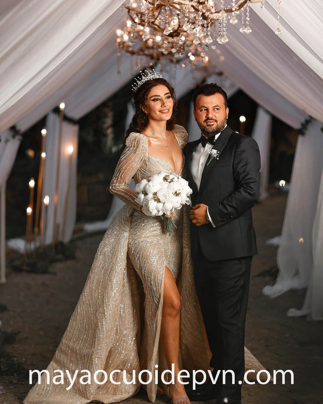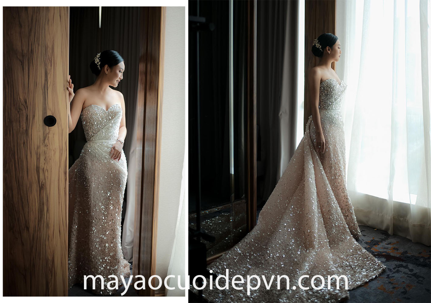 Trong đêm dạ tiệc cưới sang trọng hay tiệc thân mật trên biển, cô dâu có thể thoải mái lựa chọn cho mình kiểu đầm cưới đuôi cá dạ hội thiết kế riêng với form dáng ôm vừa phải nhưng vẫn đủ tôn dáng, giúp bạn dễ dàng hơn trong di chuyển. Toàn bộ váy cưới đính kết lấp lánh ánh bạc và vàng trên nền vải xuyên thấu gợi cảm, rất hoàn hảo cho chủ đề đám cưới dạ tiệc.