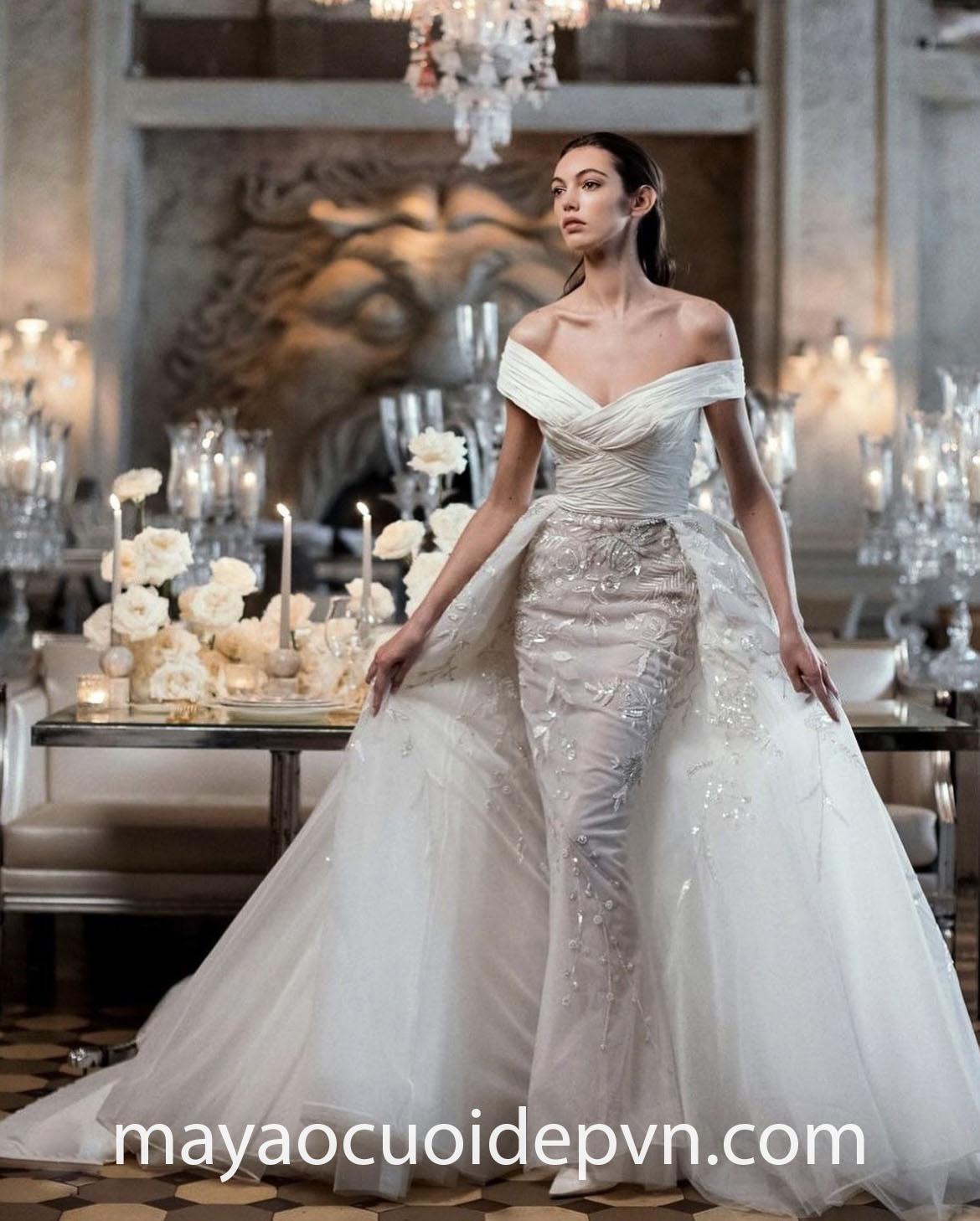 Áo cưới đuôi cá 2 trong 1 luôn nằm trong top xu hướng váy cưới được rất nhiều cô dâu sành điệu ưa thích khi bạn vừa có thể thật gợi cảm với chiếc váy cưới đuôi cá tôn dáng bên trong, lại vừa thật lộng lẫy như một nàng công chúa cổ tích khi kết hợp cùng tùng váy tháo rời xoè thướt tha.