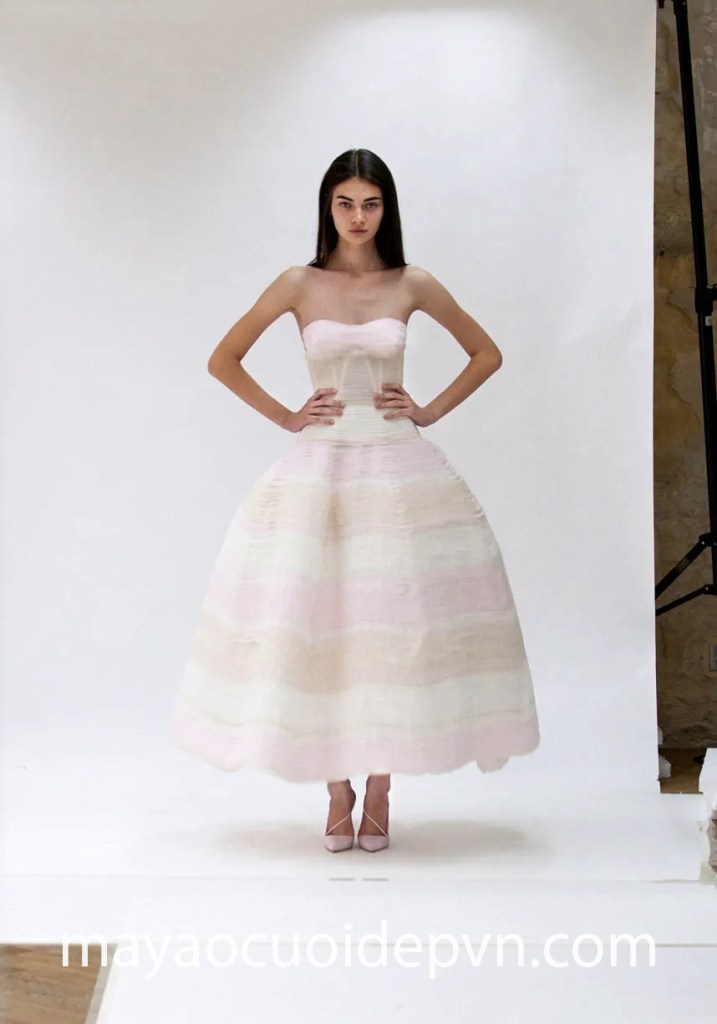 Hãy làm mới chính mình với chiếc váy cưới ngắn midi dress màu hồng pastel đầy trang nhã, phối hợp ăn ý cùng những nếp gấp tạo điểm nhấn riêng cho bộ trang phục sành điệu.