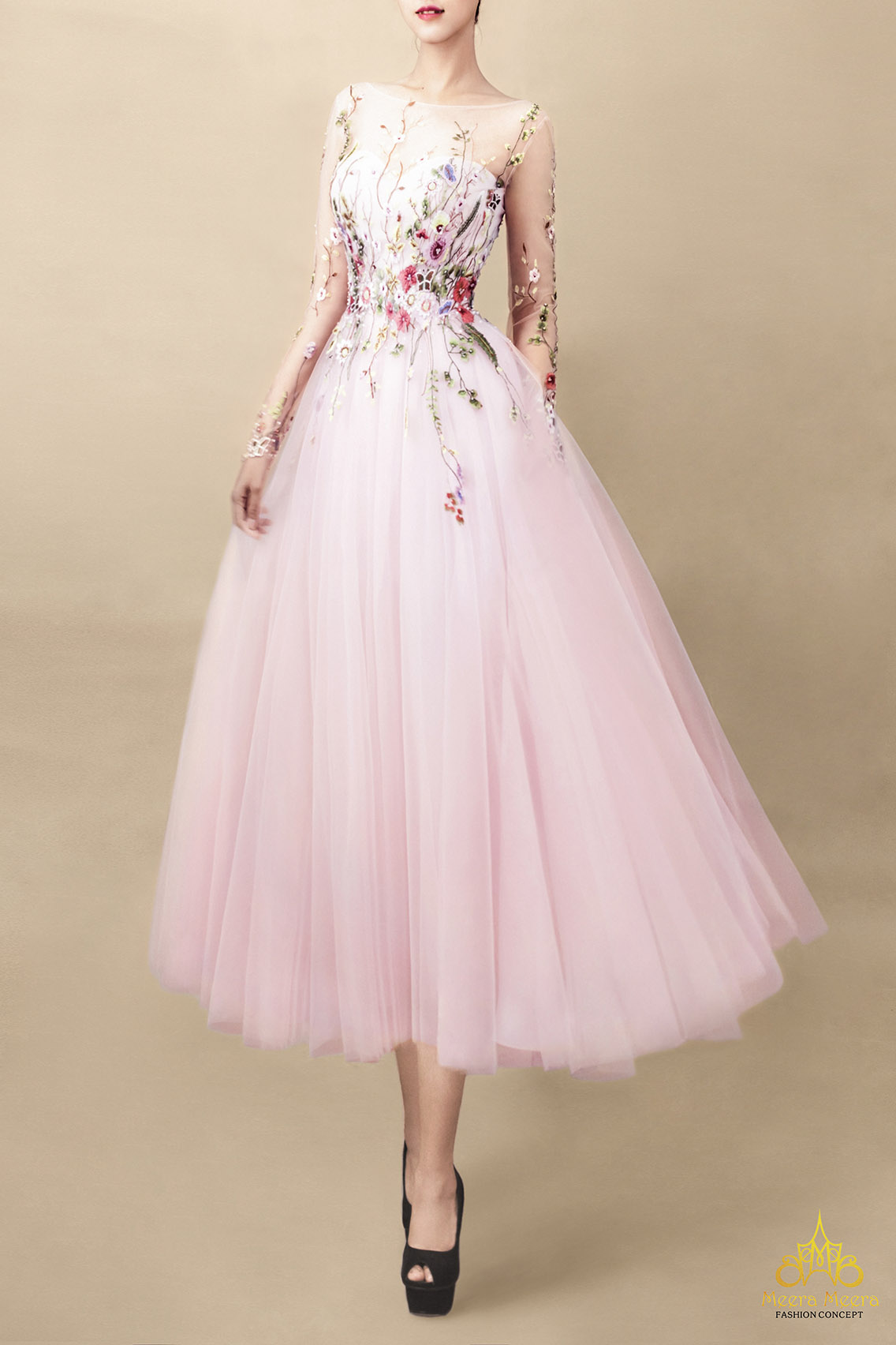 Áo cưới ngắn tea length màu hồng Meera Meera được sáng tạo dành tặng cho những nàng thơ trong các câu chuyện cổ tích diệu kỳ. Chất vải voan lưới mềm nhẹ, bay bổng trên gam màu hồng dâu ngọt ngào càng trở nên đặc sắc hơn khi kết hợp chi tiết đính kết tinh xảo, thêu dệt nên bức tranh hoa cỏ nên thơ, tưng bừng sức sống.