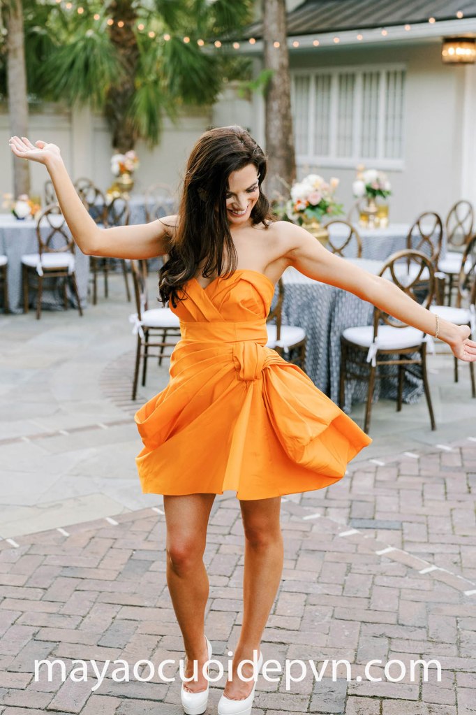 Với những cô dâu cá tính ưa chuộng phong cách thời trang khác biệt, mẫu đầm cưới ngắn mini dress màu cam chói lọi sẽ giúp bạn nổi bật giữa đám đông, kết hợp cùng những nếp gấp xếp nơ đầy tinh tế.