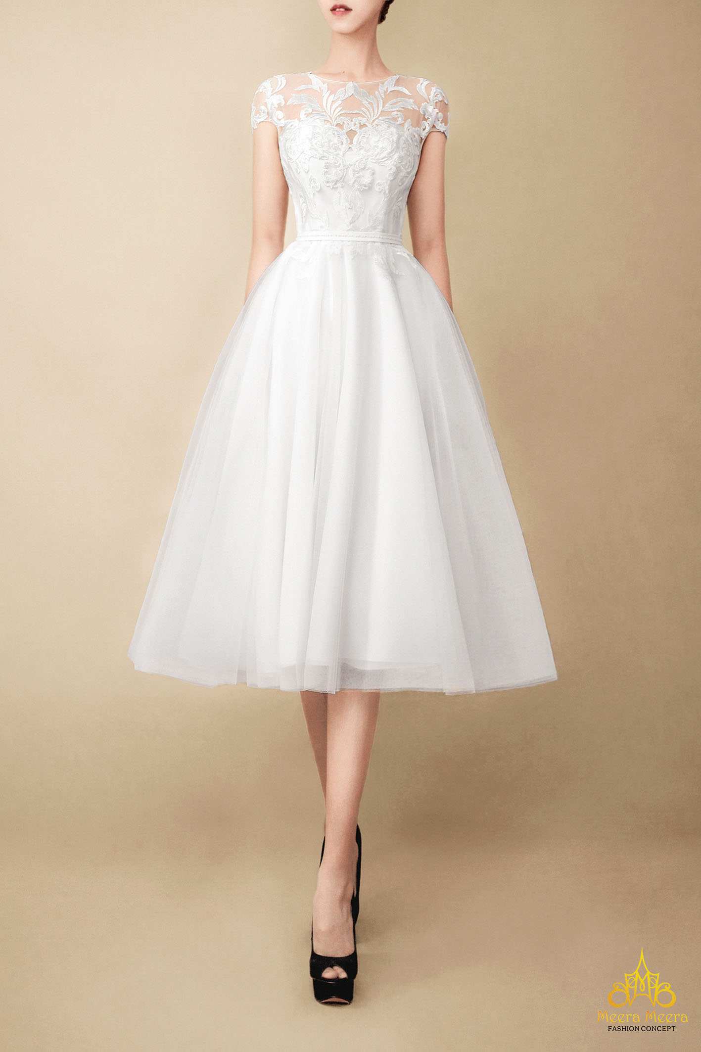 Bạn cũng có thể kết hợp nhiều chất liệu để tạo nên các hiệu ứng đặc sắc cho chiếc váy cưới của riêng mình. Mẫu váy cưới ngắn midi dress Meera Meera mang đến cho cô dâu sự thanh lịch quý phái với form dáng tùng xoè bay bổng, nổi bật cùng hoạ tiết ren trang trọng điểm xuyết pha lê lấp lánh.