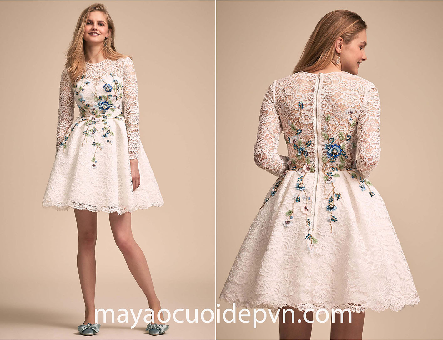 Mẫu váy cưới ngắn thêu ren tay dài trang trọng sẽ càng thêm ấn tượng khi được trang trí cùng những hoạ tiết hoa cỏ đính kết đầy ngẫu hứng bên trên.
