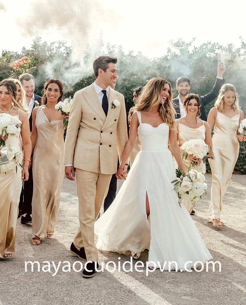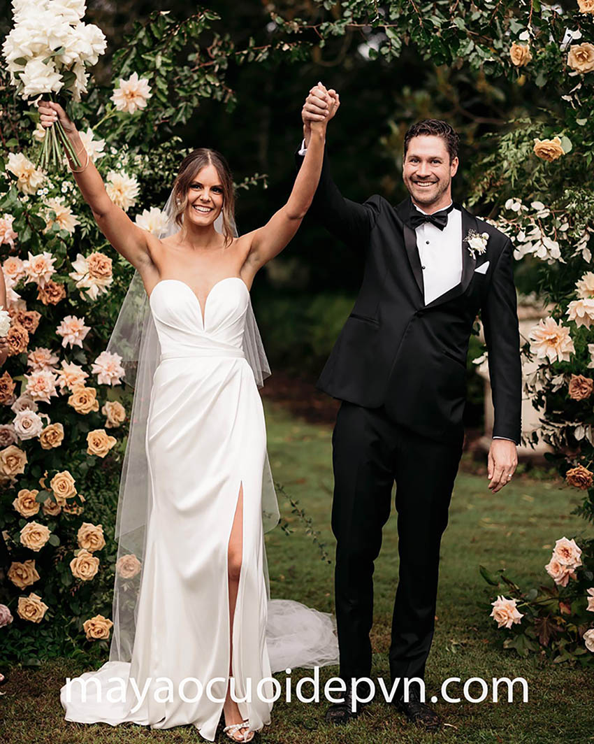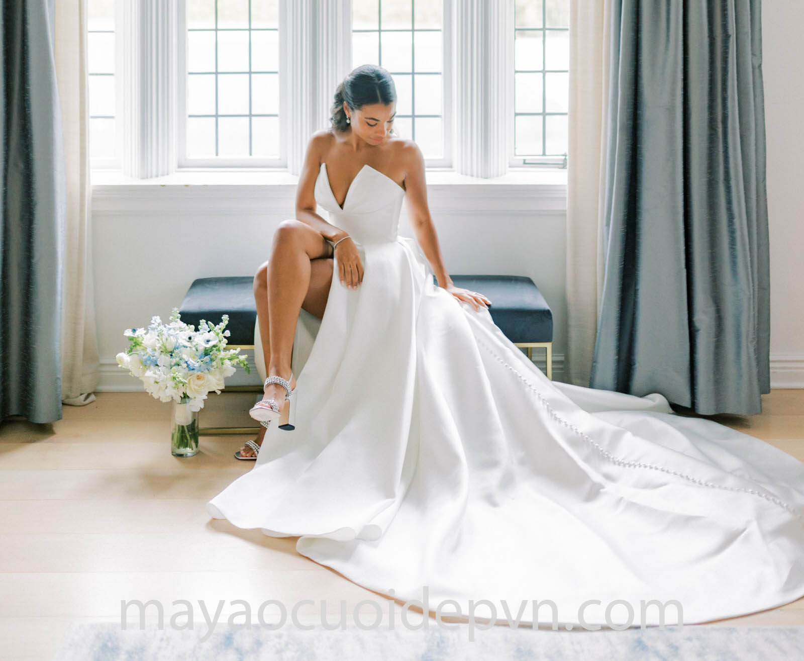Áo cưới cúp ngực xẻ tà tối giản sẽ rất thích hợp cho những cô dâu vừa thích tôn dáng, lại vừa ưa chuộng phong cách minimalist. Chất liệu satin đứng phom, hay lụa ôm sát đường cong sẽ giúp bạn khoe dáng hoàn hảo nhất có thể.