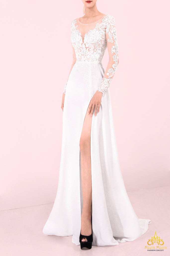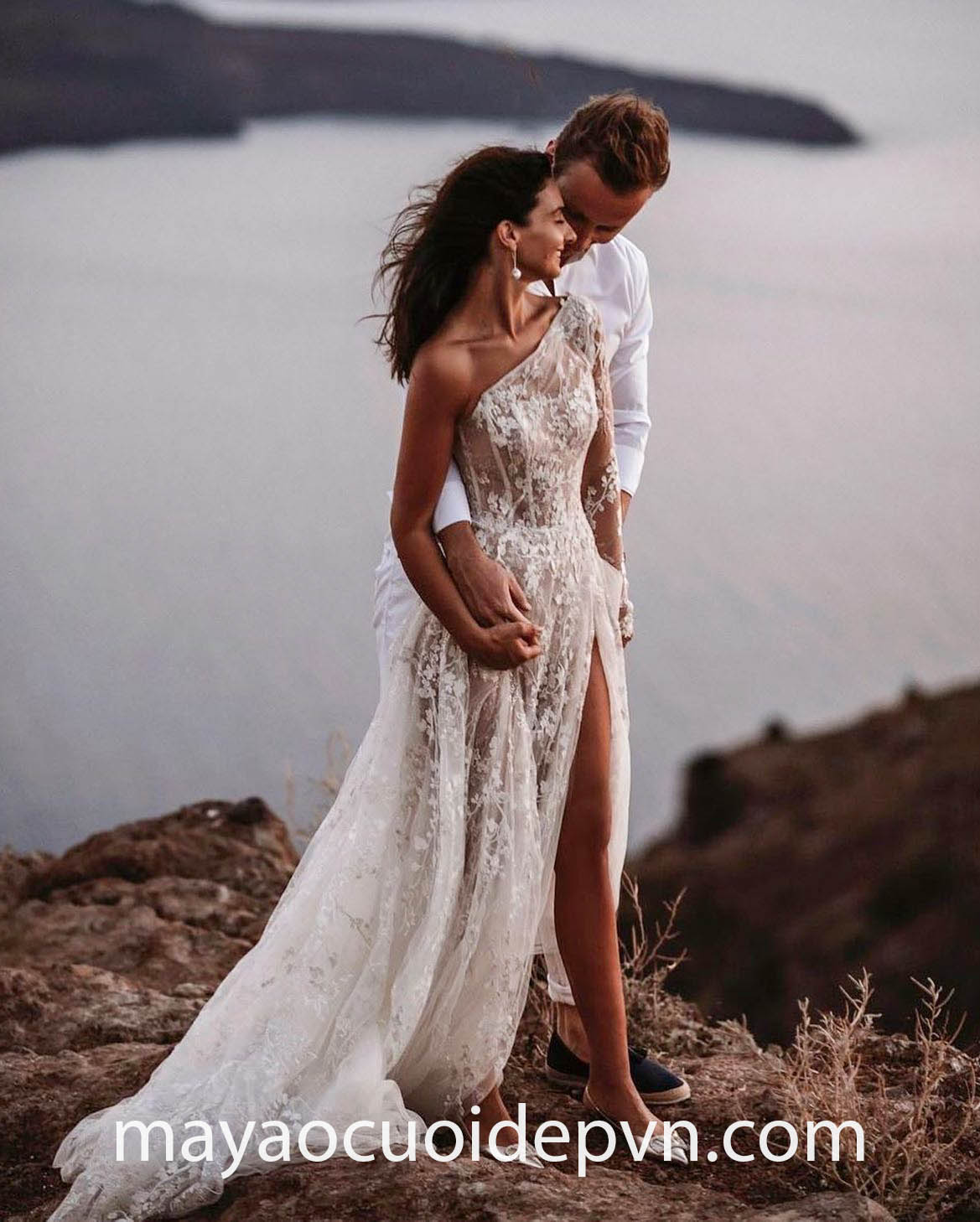 Bạn là một cô dâu sành điệu và mong muốn khác biệt với số đông? Đầm cưới xẻ tà lệch vai tay dài với thiết kế thêu ren nổi bật trên nền vải xuyên thấu hấp dẫn sẽ là lựa chọn hoàn hảo mà bạn đang tìm kiếm.