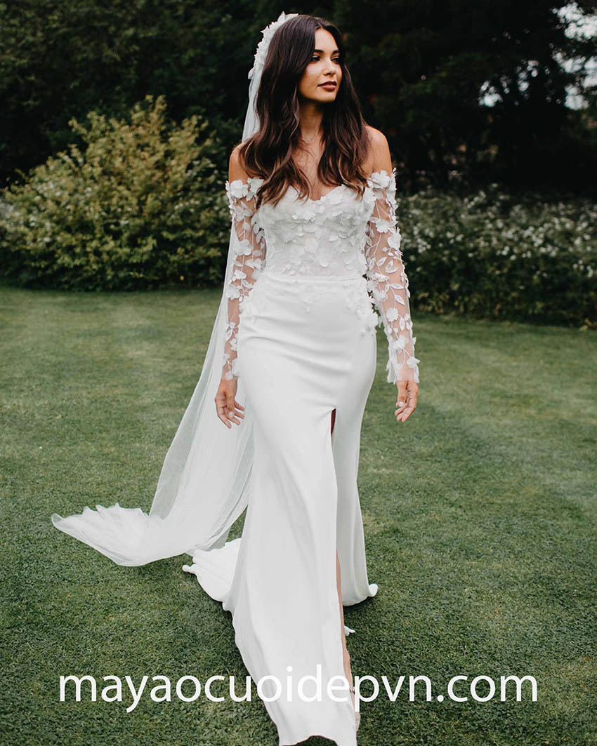 Bên cạnh đó, váy cưới xẻ tà trễ vai quyến rũ, phối hợp ăn ý hai chất liệu lụa và ren sẽ là gợi ý tuyệt vời cho các cô dâu theo đuổi phong cách trang trọng, quý phái.