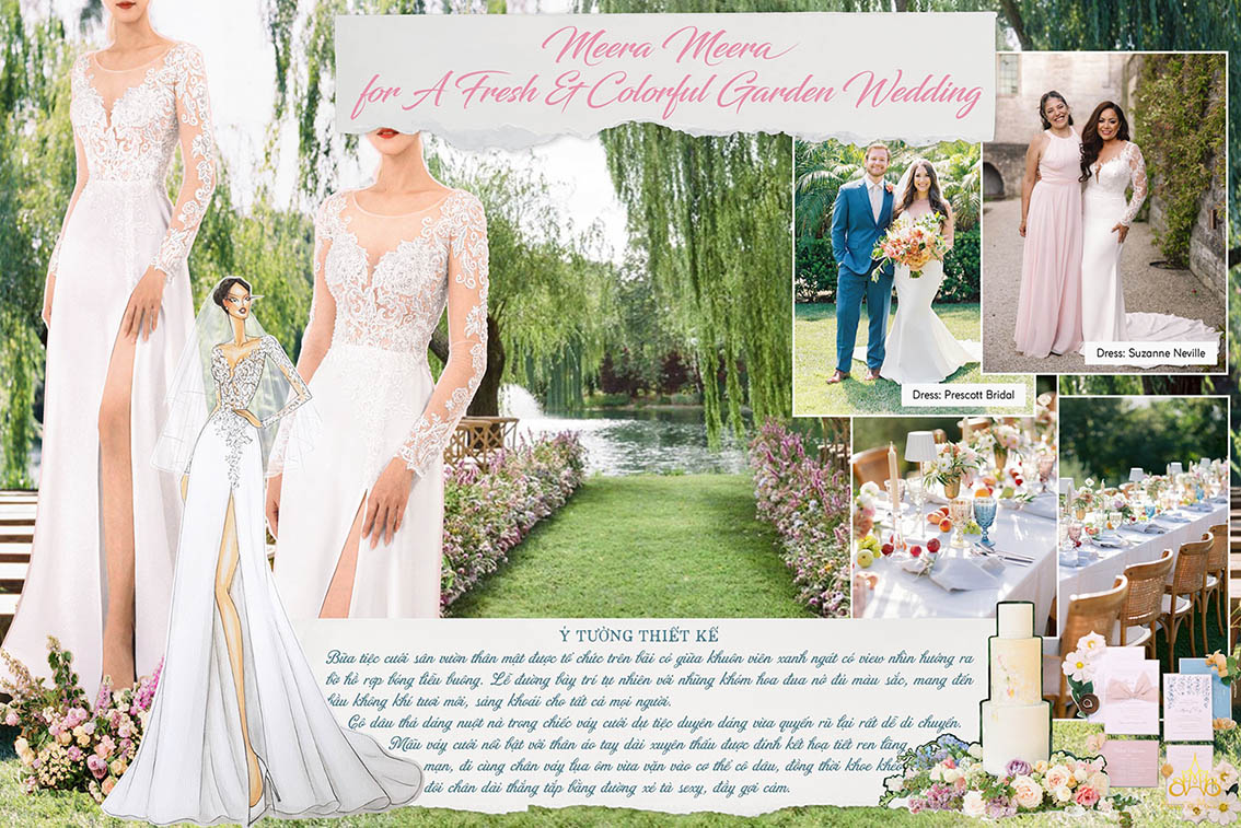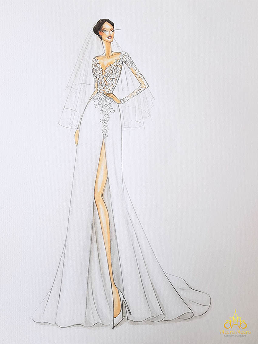 Với đề bài thiết kế áo cưới cho cô dâu ưa chuộng phong cách gợi cảm nhưng vẫn thật trang trọng, Meera Meera đã phác thảo nên chiếc áo cưới xẻ tà tay dài đặc biệt dành riêng cho cô dâu sành điệu.