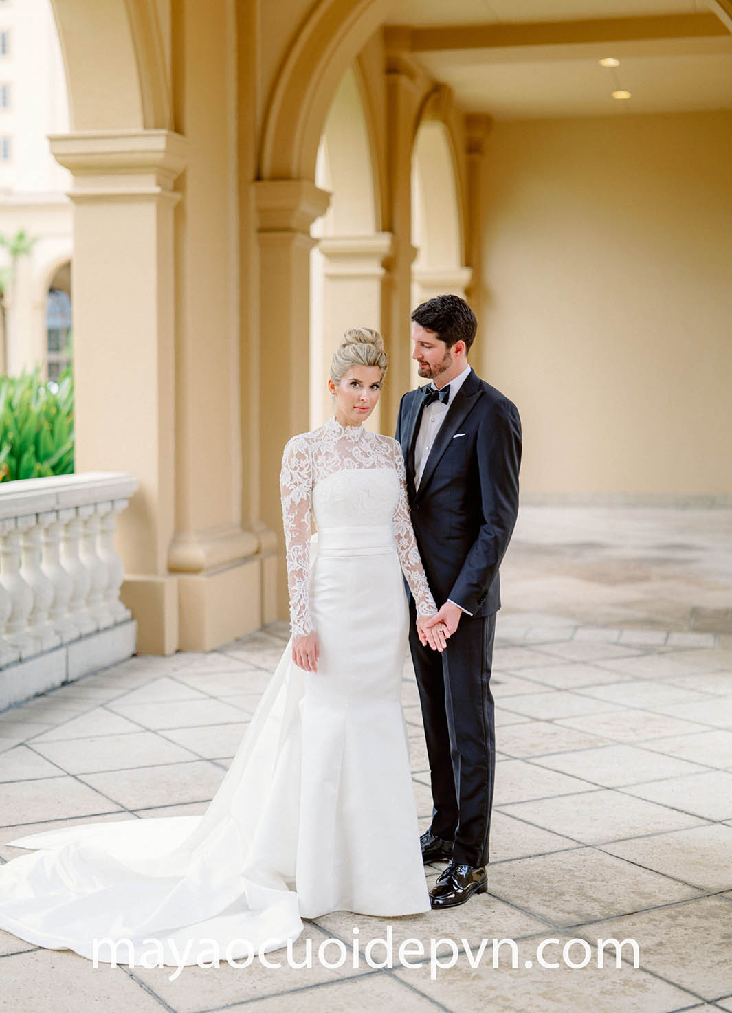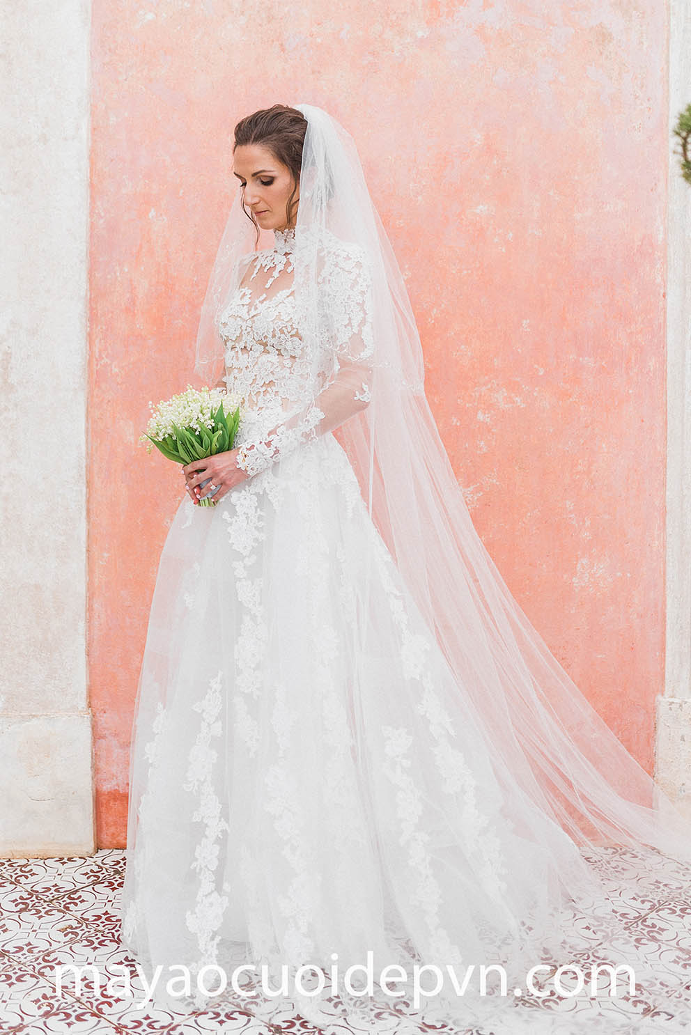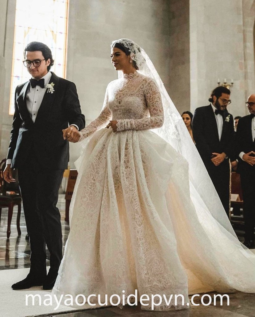 Đặc biệt với những đám cưới tổ chức trong Nhà thờ, áo cưới tay dài ren có phần cổ áo cao kín đáo, đi cùng tay áo dài và tùng váy thêu ren lãng mạn sẽ là lựa chọn tuyệt vời cho lễ cưới cổ tích mà bạn hằng ao ước.