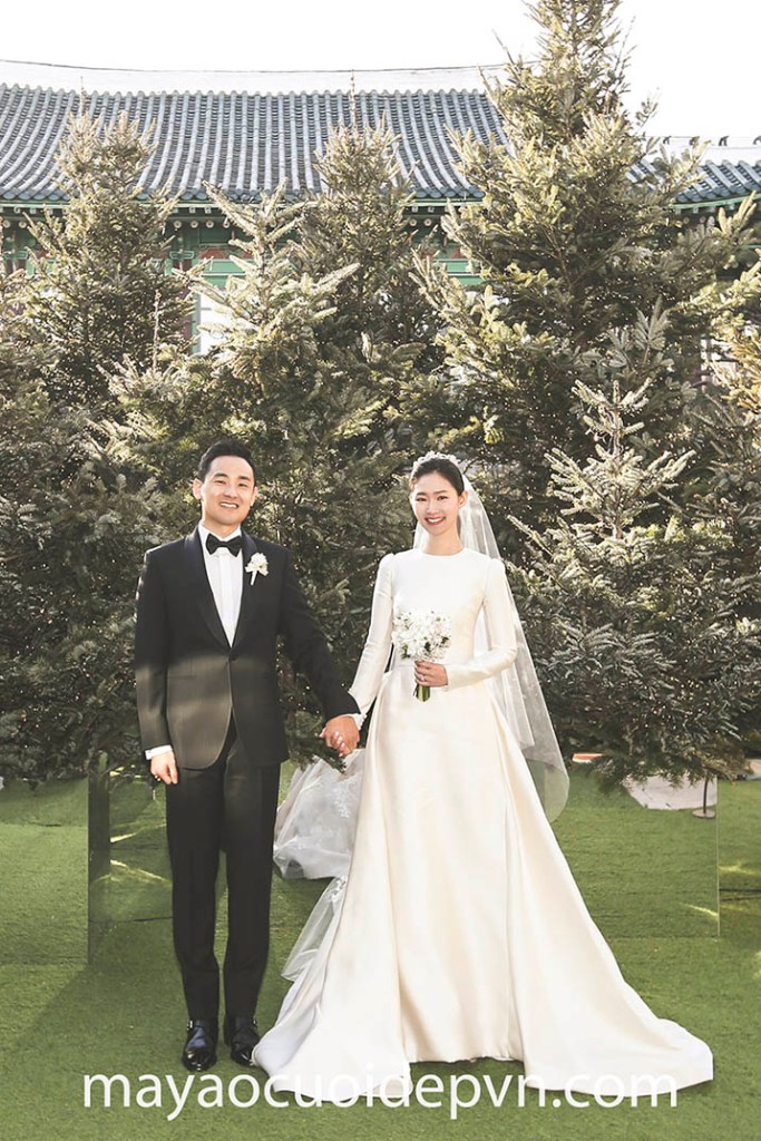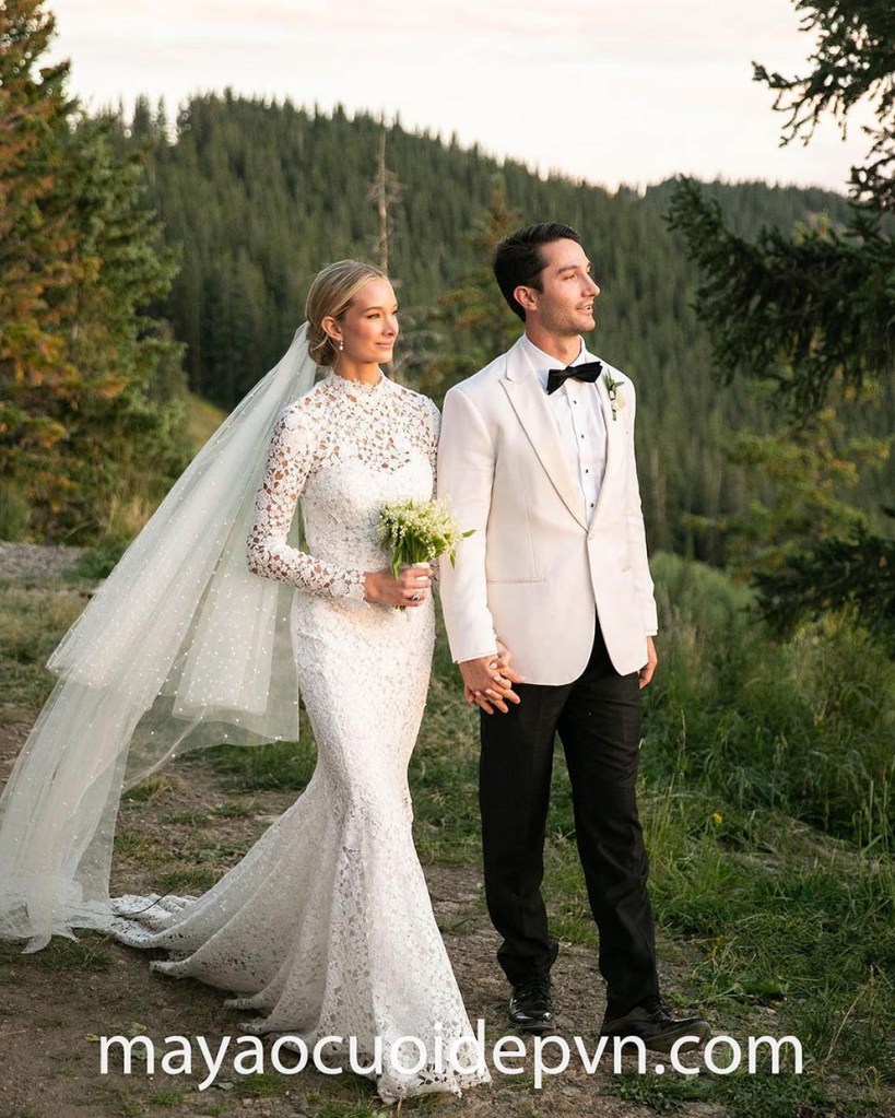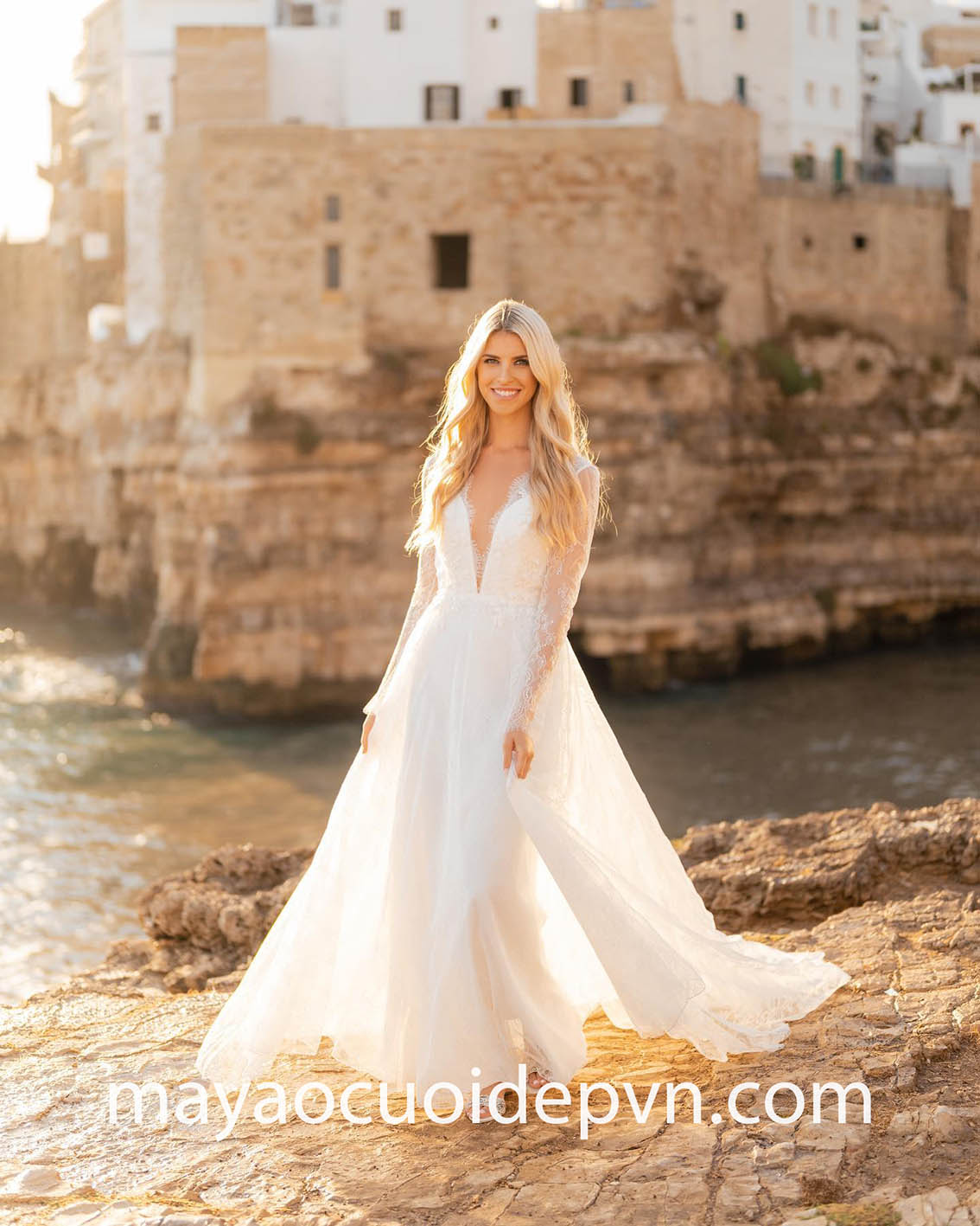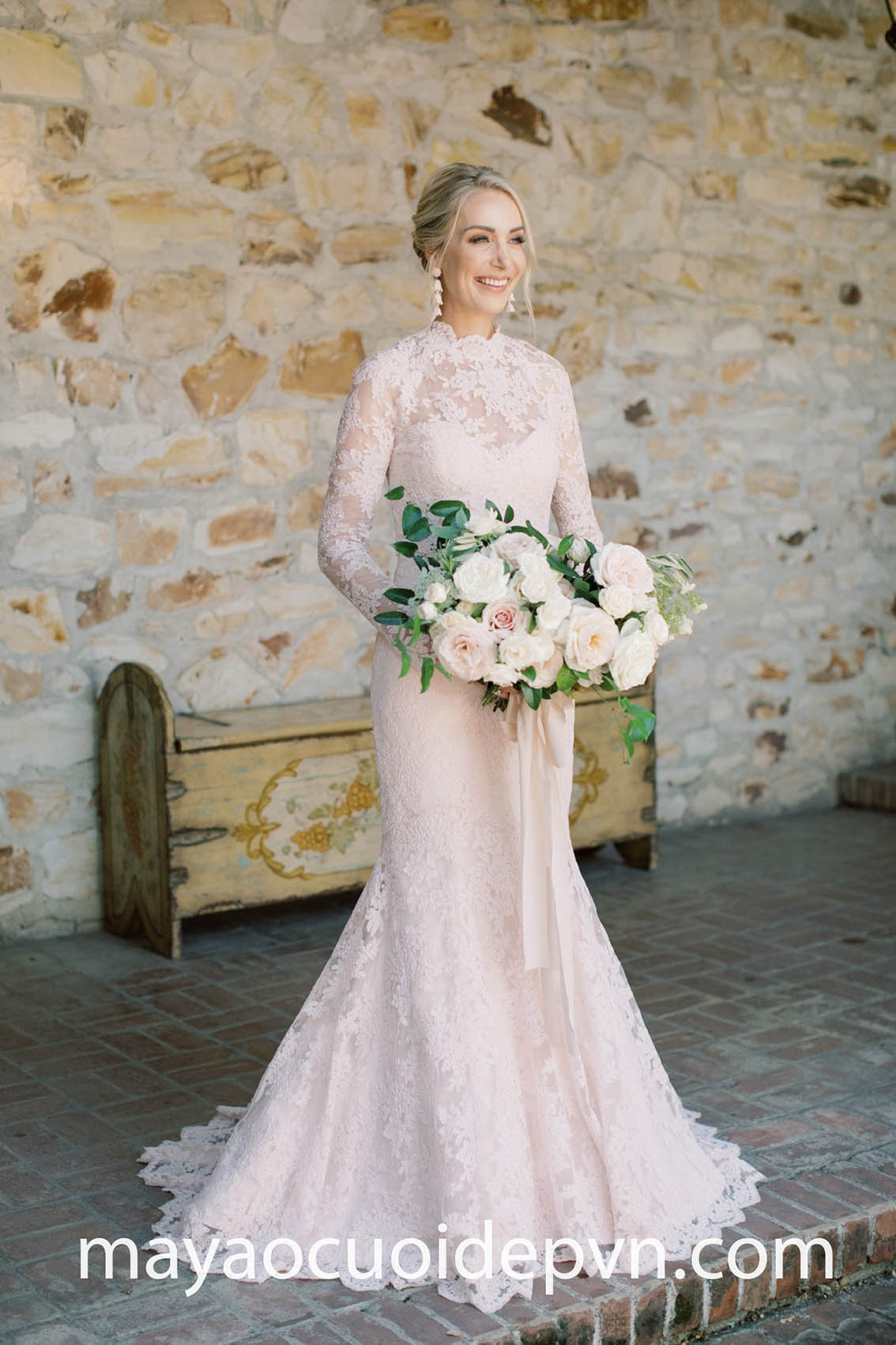 Đặc biệt với những đám cưới tổ chức trong Nhà thờ, áo cưới tay dài ren có phần cổ áo cao kín đáo, đi cùng tay áo dài và tùng váy thêu ren lãng mạn sẽ là lựa chọn tuyệt vời cho lễ cưới cổ tích mà bạn hằng ao ước.