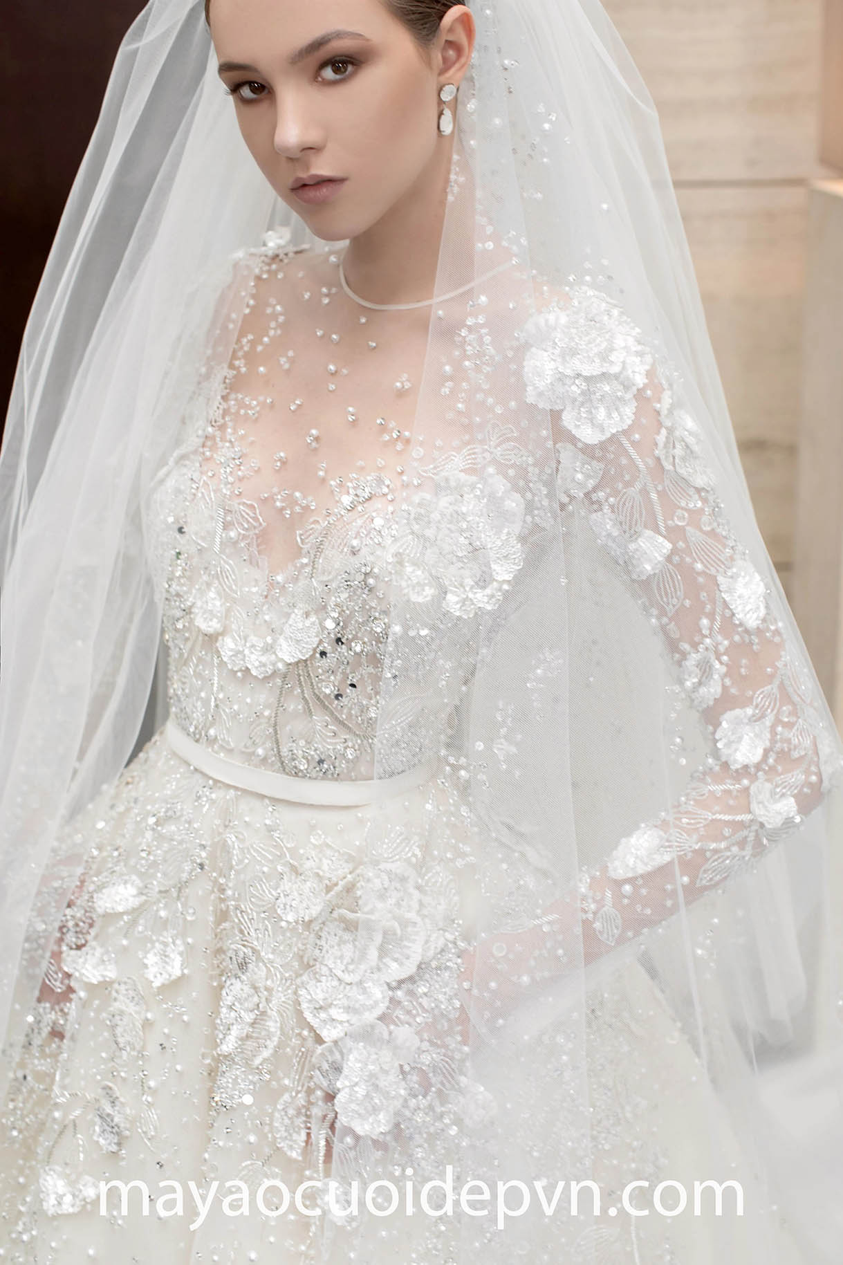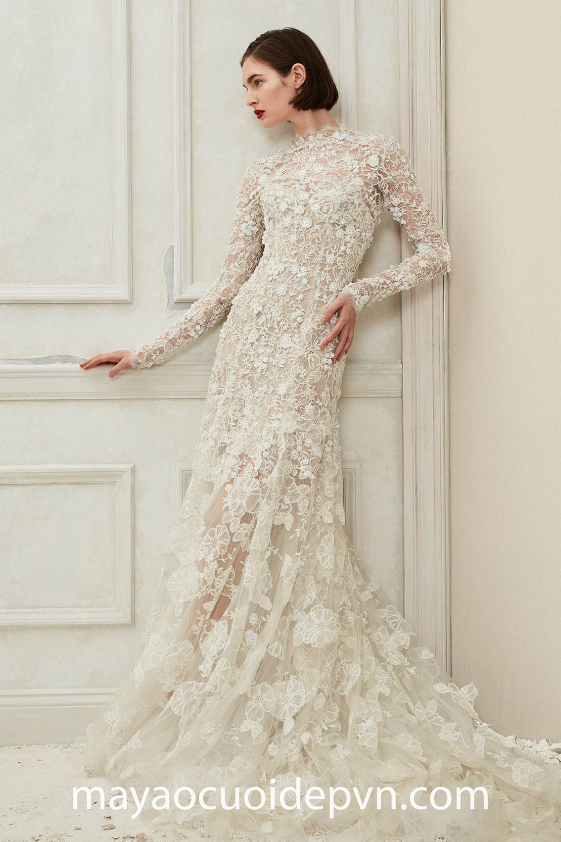Đặc sắc nhất phải kể đến những mẫu áo cưới tay dài Haute Couture được thiết kế dành riêng cho từng cô dâu với kiểu mẫu độc lạ, tôn dáng và trang trí lộng lẫy, xa hoa, tinh xảo đến từng chi tiết nhỏ.