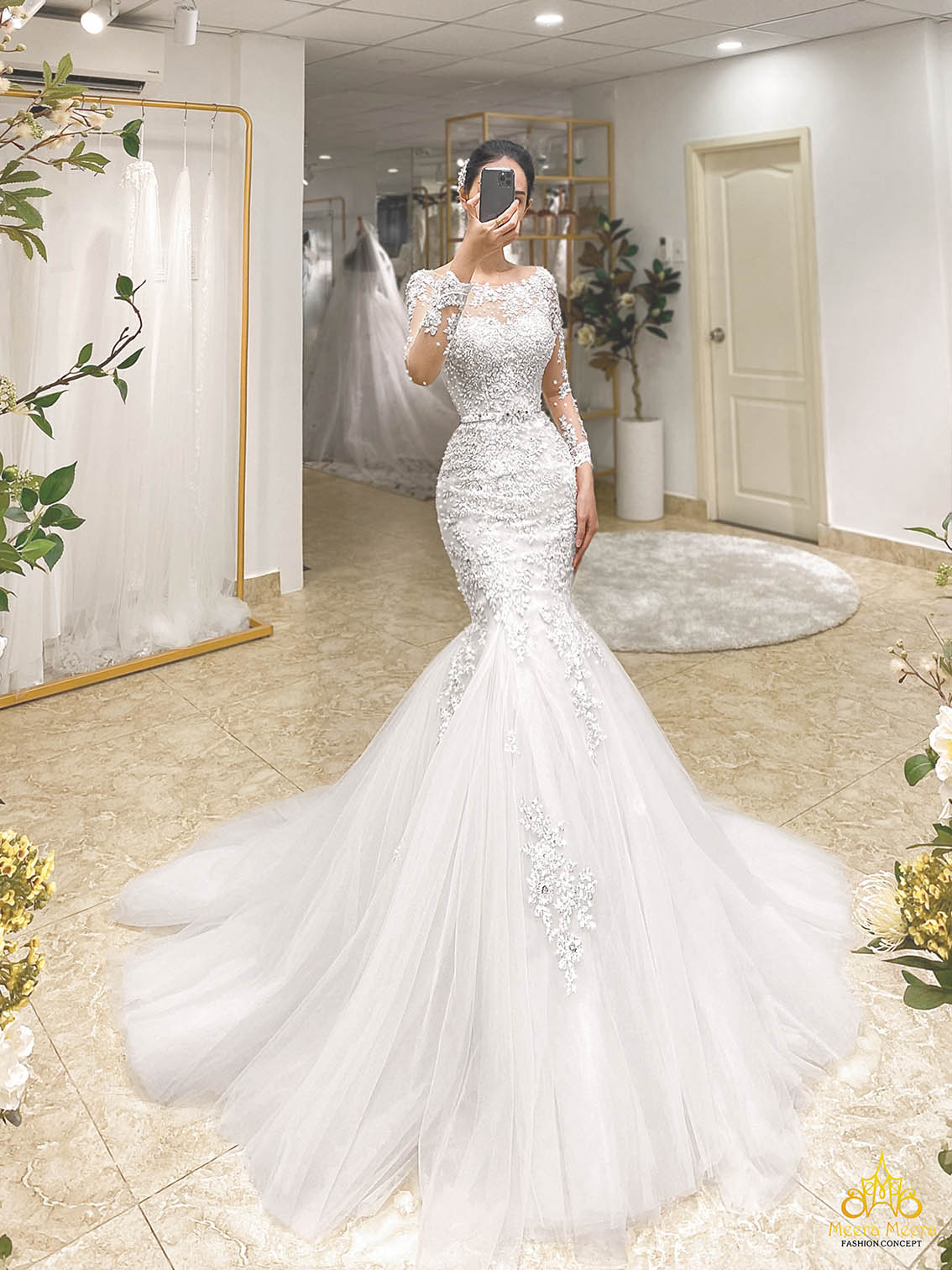 Trong khi đó, áo cưới đuôi cá ren tay dài mang đến cho bạn hình ảnh của một cô dâu thanh lịch, quý phái mà lại đầy hấp dẫn với form váy tôn dáng nuột nà.