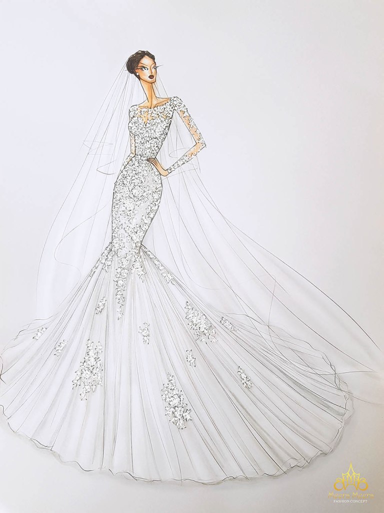 Tương tự với cách thức làm việc của những nhà mốt quốc tế, mỗi chiếc áo cưới tay dài custom made tại nhà Meera Meera được hình thành từ bản vẽ sketch phác thảo tuyệt đẹp và chi tiết nhất.