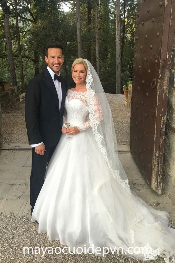 Cô dâu ưa thích phong cách Hoàng gia có thể lựa chọn cho mình kiểu áo cưới công chúa tay dài ren với cổ áo cao, tay dài lịch thiệp đi cùng tùng váy xếp múi lạ mắt để tạo dấu ấn cho riêng mình.