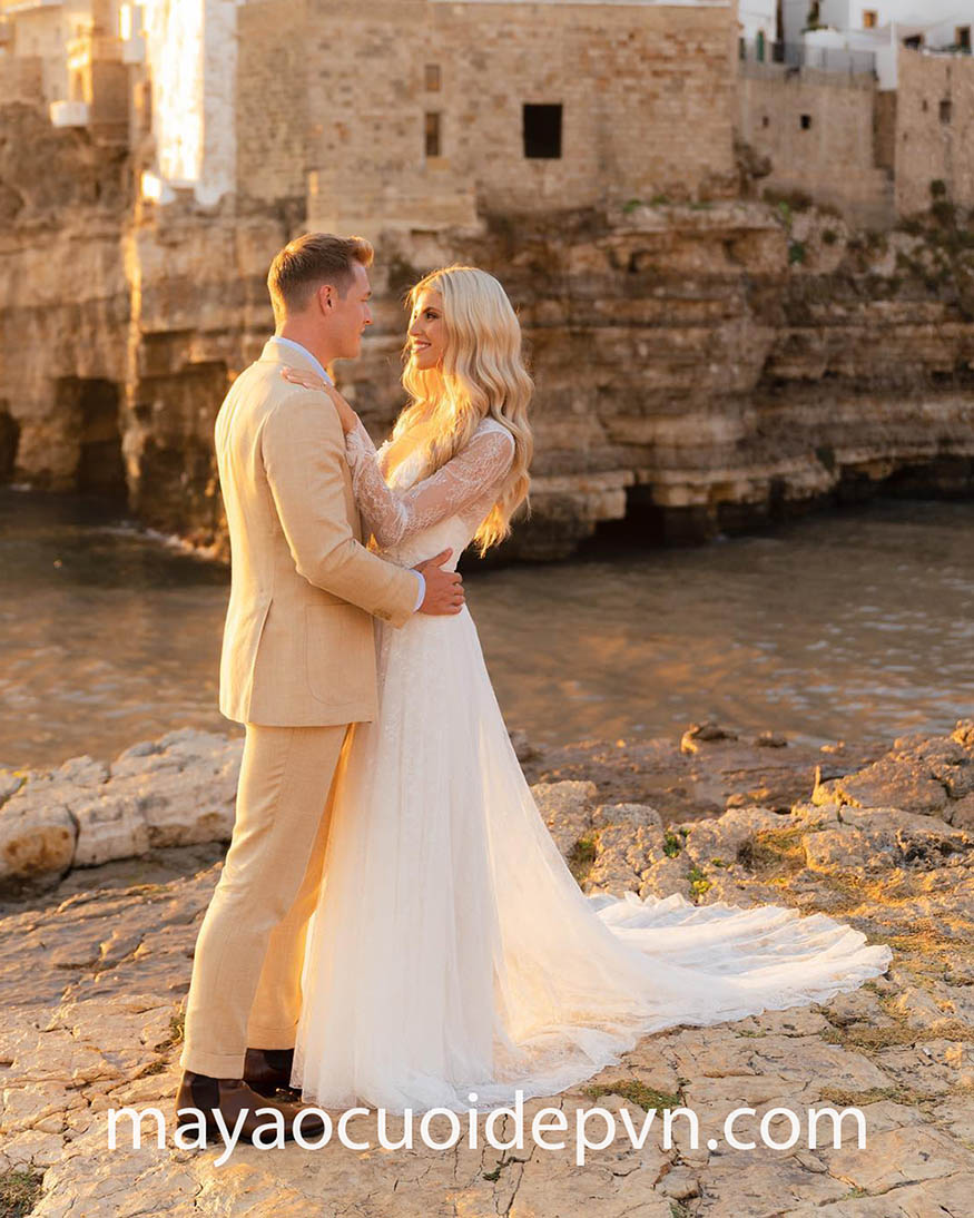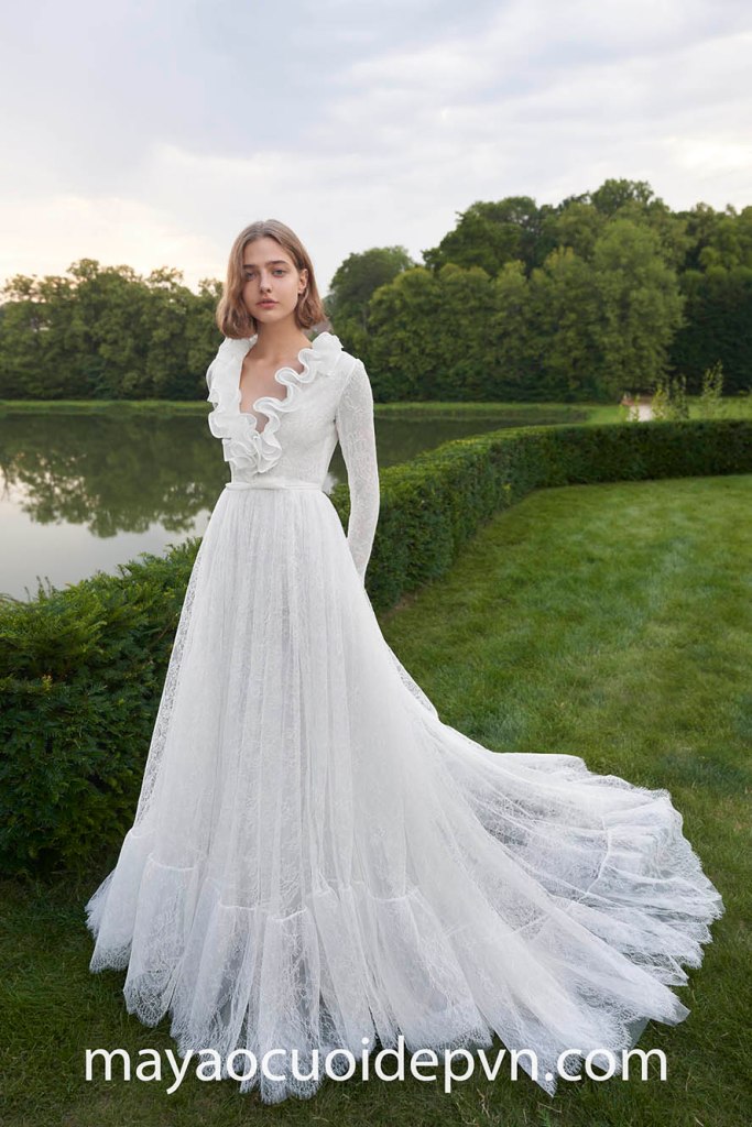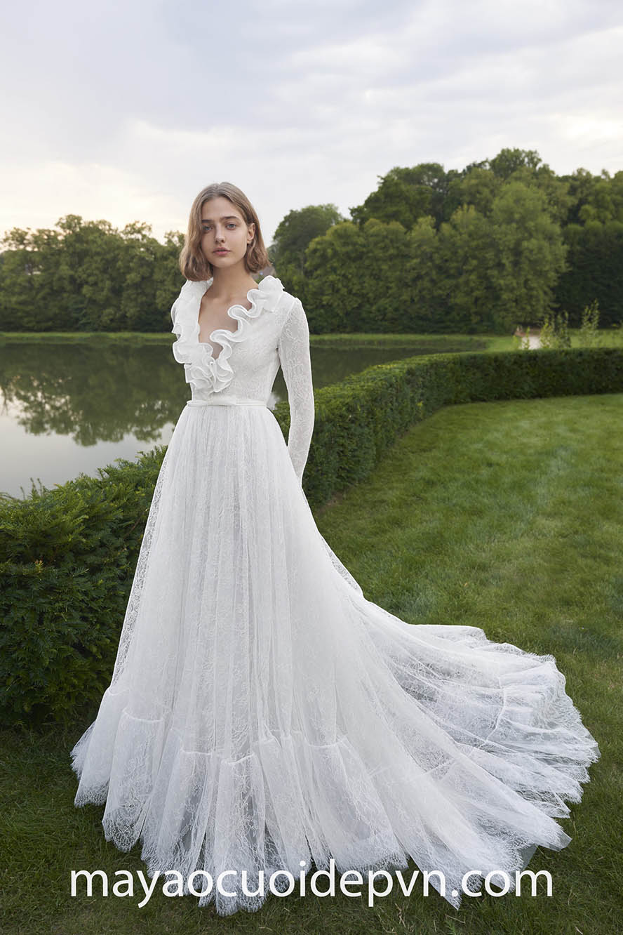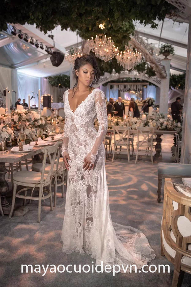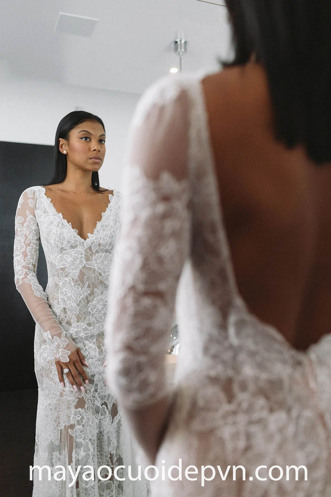 Hoặc bạn cũng có thể trở nên nhẹ nhàng, thướt tha như một nàng thơ trong chiếc váy cưới tay dài ren Chantilly với những lớp ren mỏng nhẹ, xuyên thấu góp phần tôn vinh thêm nét gợi cảm cho bạn.