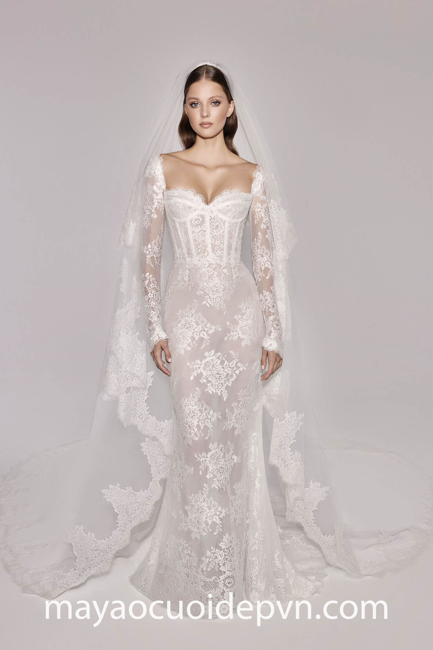 Với những cô dâu sở hữu vóc dáng đồng hồ cát, áo cưới đuôi cá corset ren Chantilly sẽ giúp bạn khai thác tối đa lợi thế hình thể với cổ áo mở khoe trọn bờ vai xương quai xanh, đi cùng tay dài trang trọng với hệ thống cúp ngực corset vô cùng gợi cảm. Đặc biệt, nền vải ren Chantilly mỏng manh tạo hiệu ứng “nửa kín nửa hở” sẽ khiến bất kỳ ai cũng đều phải xiêu lòng.