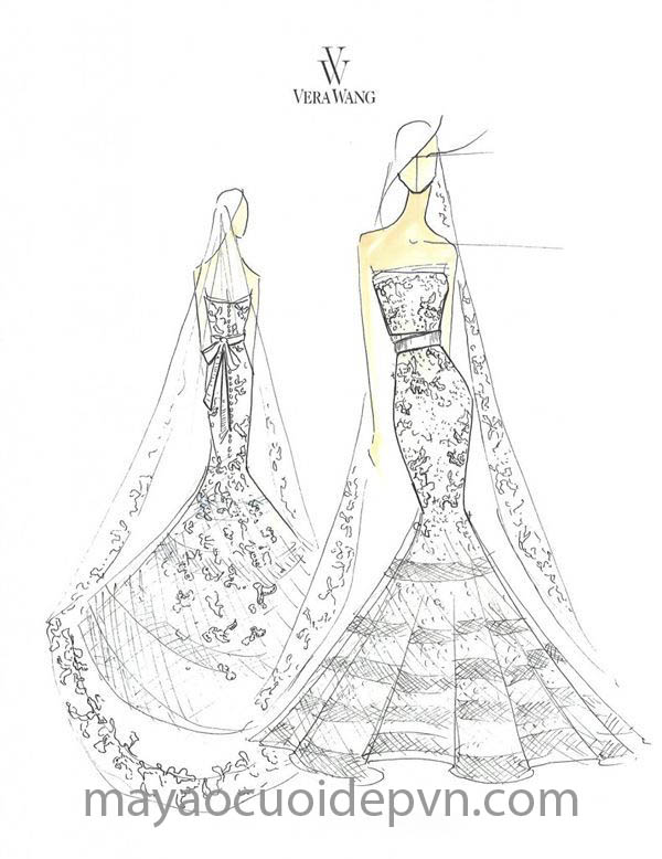 Đầu tiên, mỗi chiếc áo cưới ren Chantilly custom đều được hình thành từ bản vẽ sketch phác thảo tuyệt đẹp và chi tiết nhất.