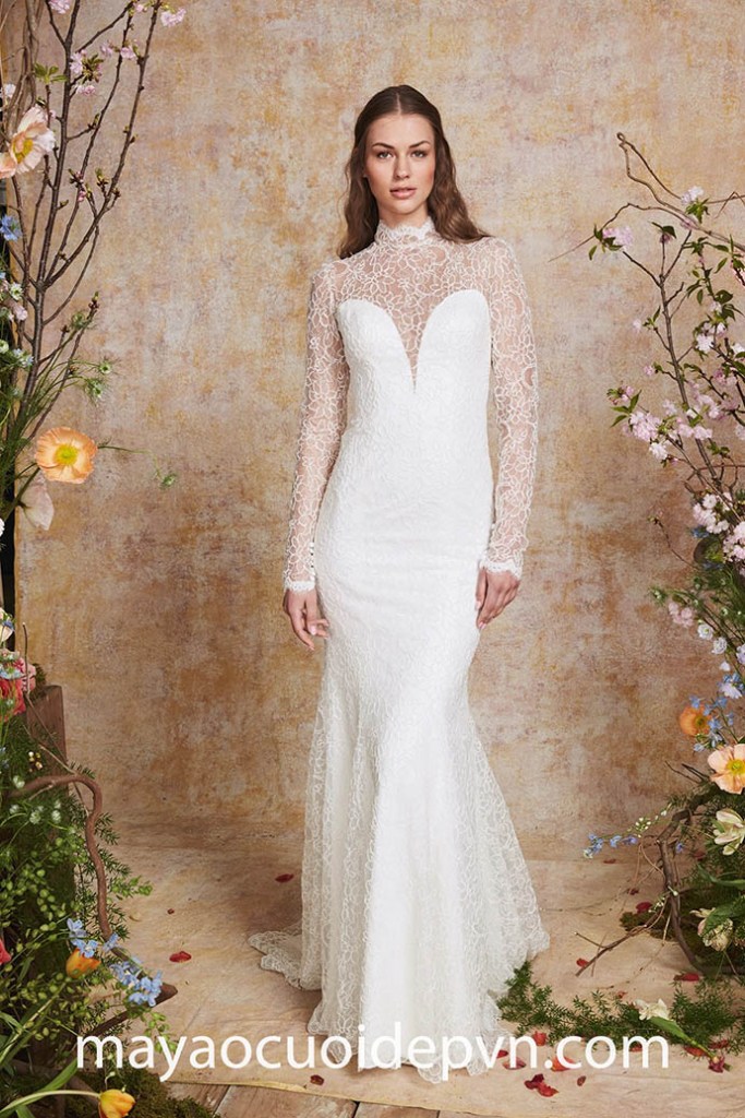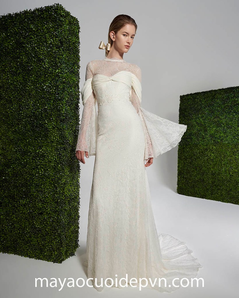 Cô dâu ưa chuộng nét gợi cảm nhưng vẫn cần đảm bảo sự kín đáo có thể lựa chọn cho mình kiểu áo cưới đuôi cá cổ cao tay dài ren Chantilly, lớp lót có thể là satin hoặc lụa, vừa giúp bạn khoe khéo đường cong cơ thể mà lại đầy thanh lịch khi cử hành hôn lễ.