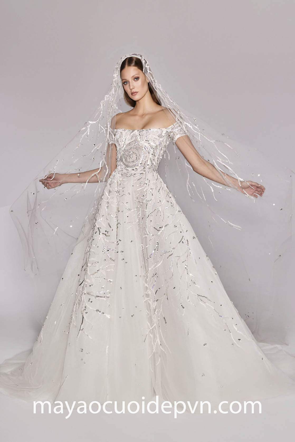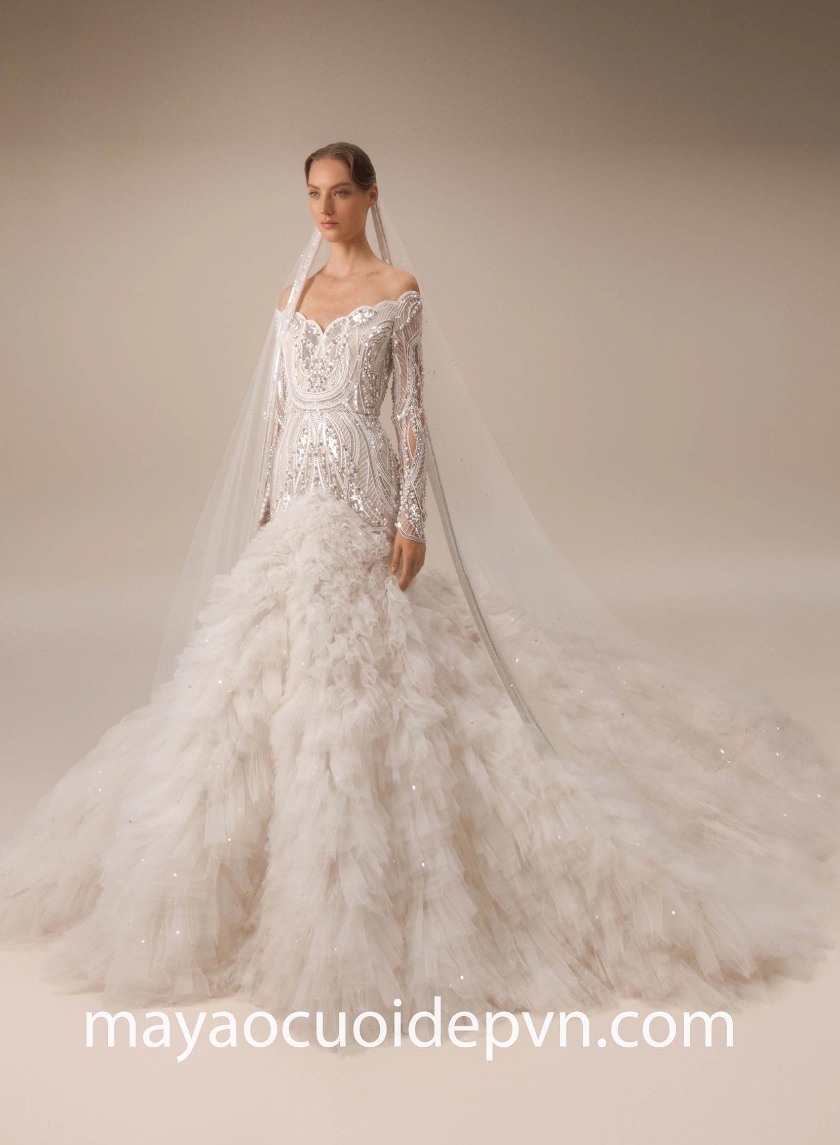 Đặc sắc nhất có thể kể đến là kiểu áo cưới trễ vai Haute Couture với thiết kế độc bản có thân áo trễ vai đính kết công phu, tôn vinh số đo ba vòng, kết thúc bằng tùng váy xếp bèo tầng sẽ tạo điểm nhấn vô cùng ấn tượng trong đám cưới cổ tích mà bạn hằng ao ước.