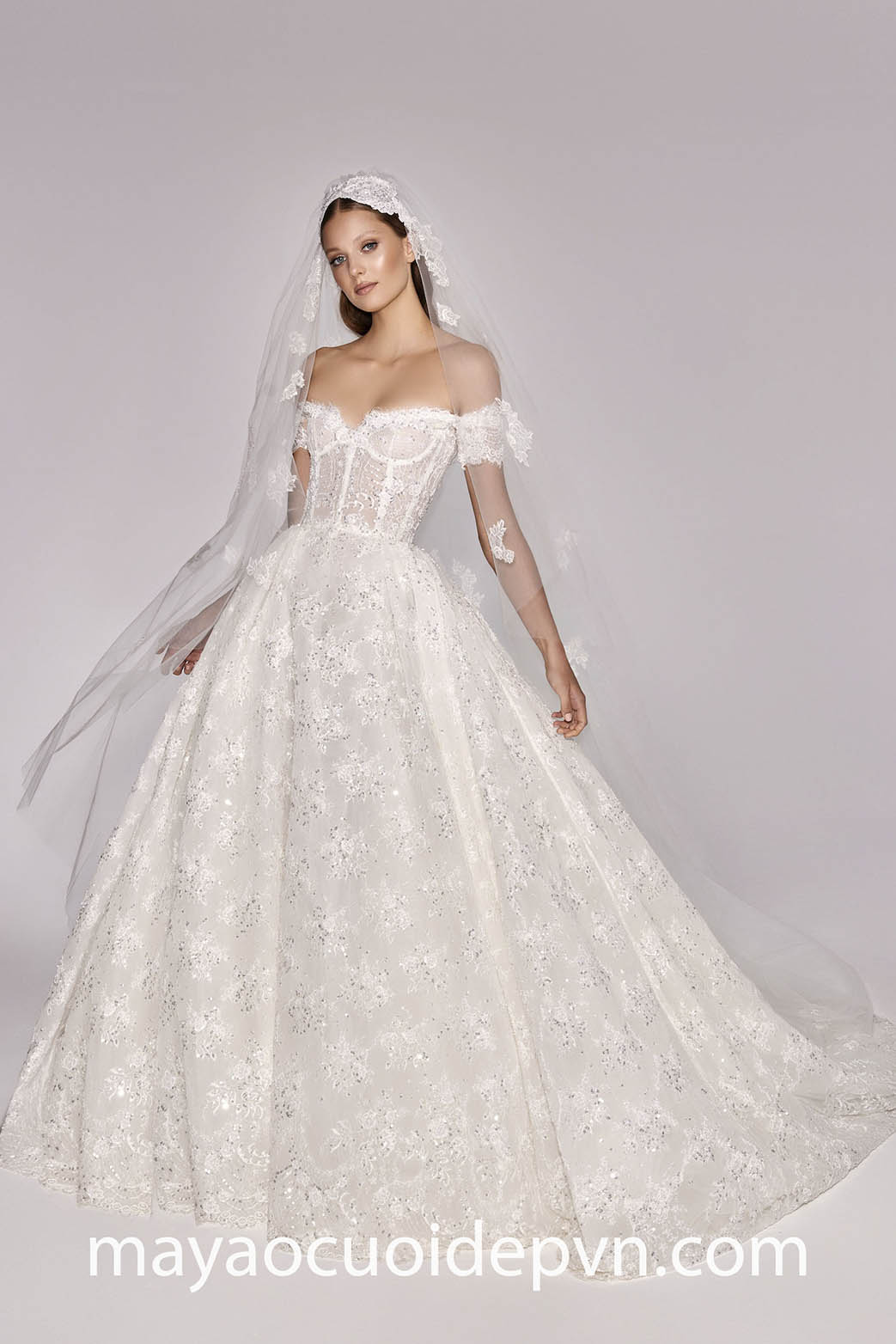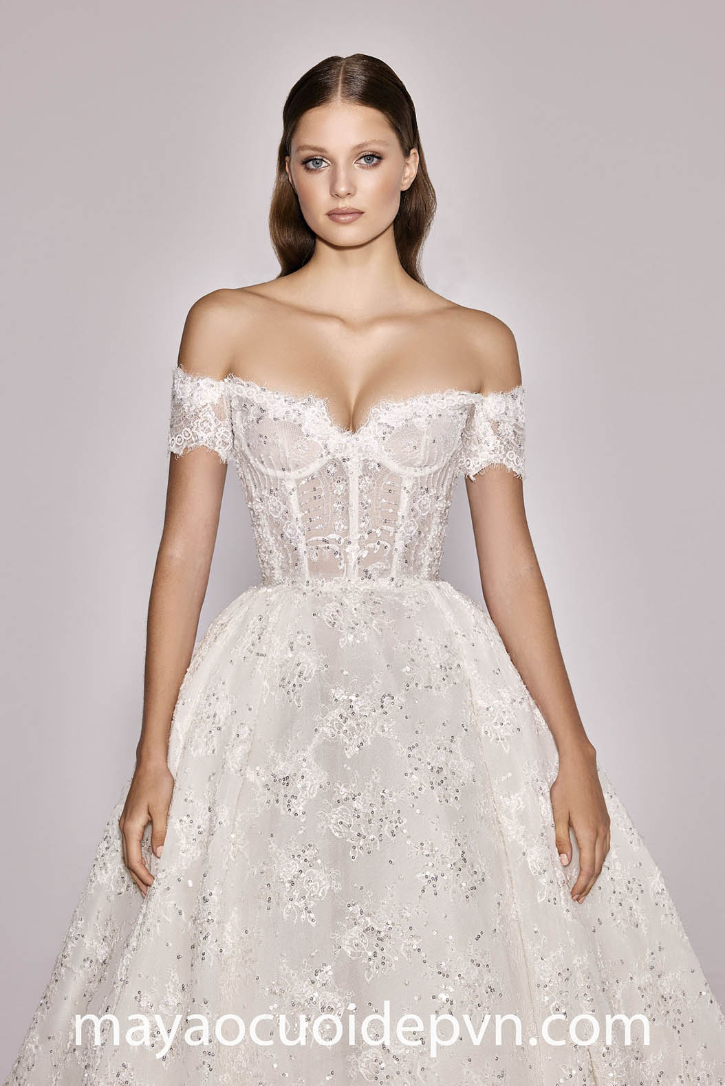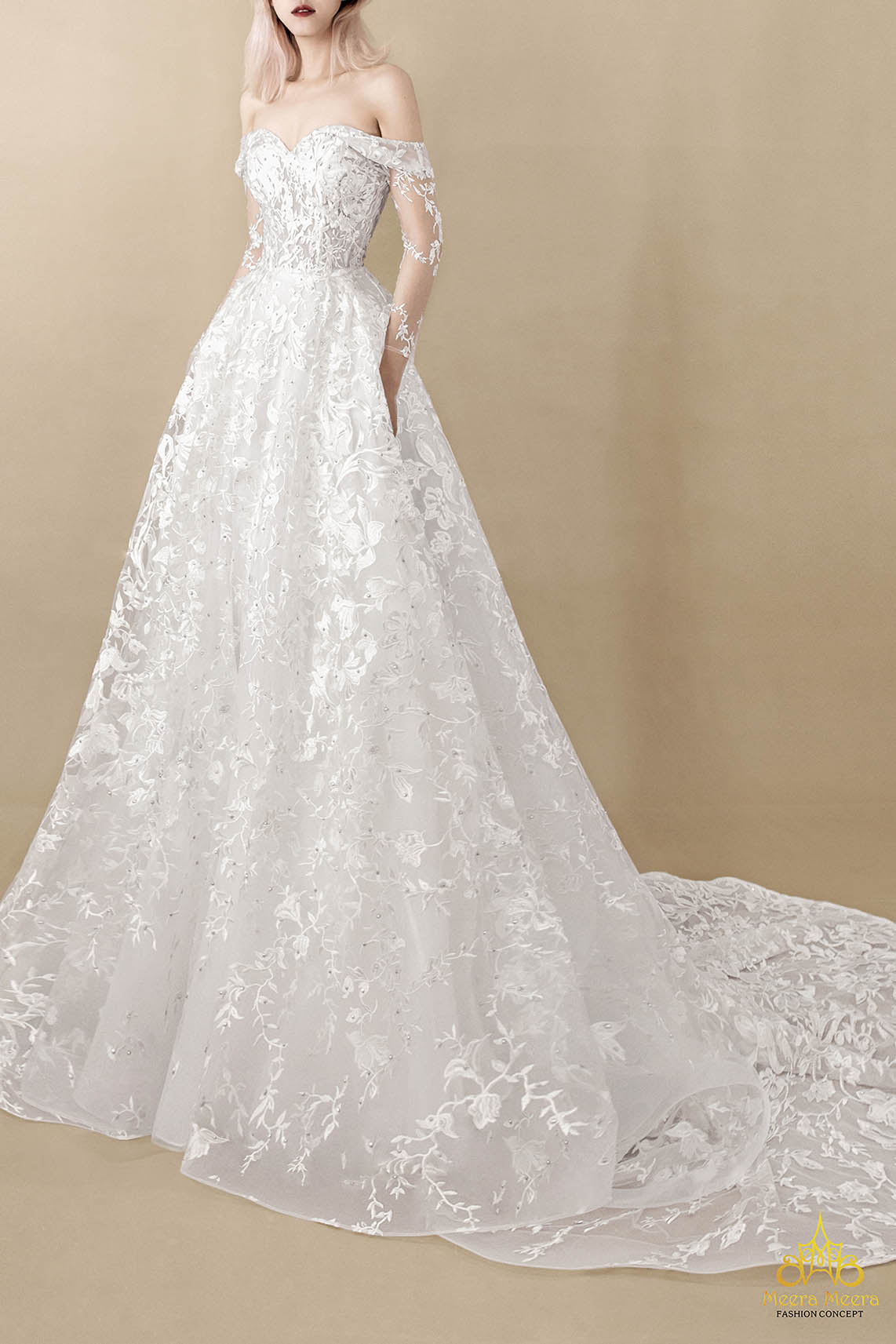 Đầm cưới công chúa trễ vai với hoạ tiết đính kết lấp lánh sẽ thích hợp cho những đám cưới quy mô lớn, bày trí cầu kỳ và xa hoa.