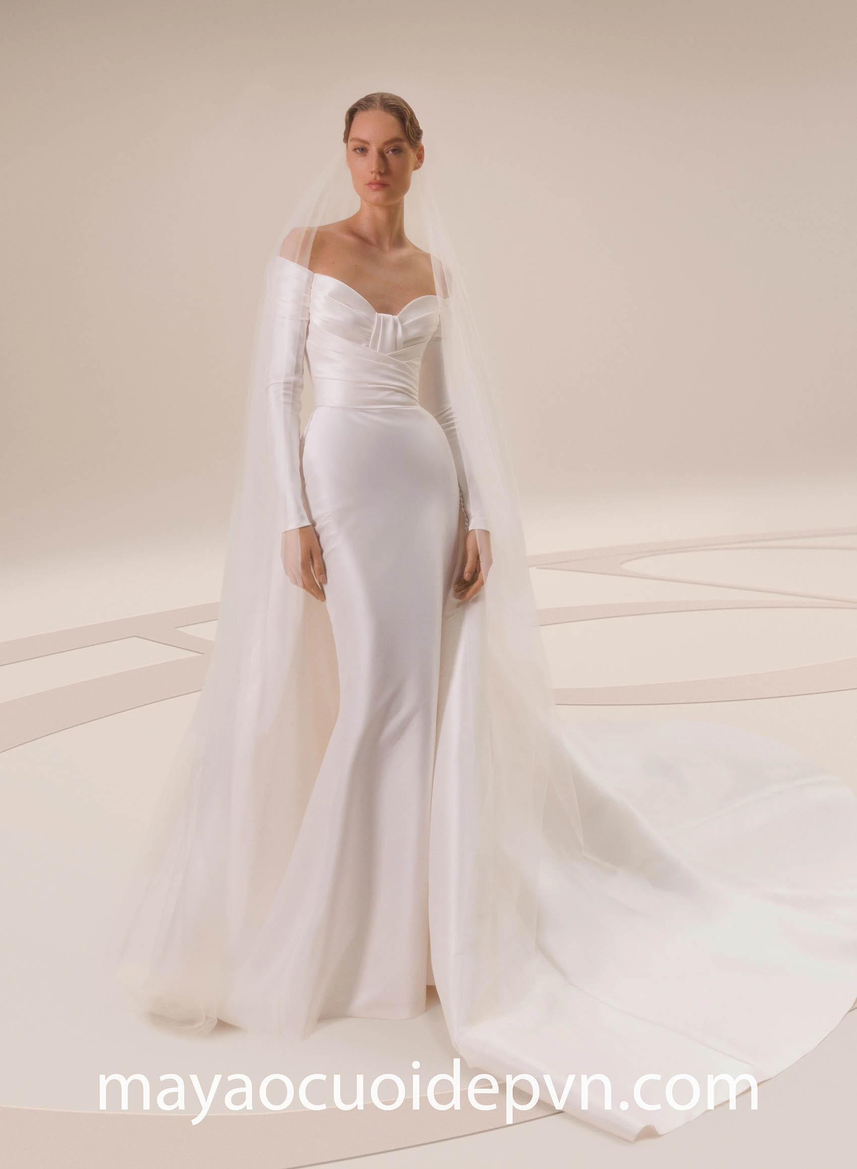 Phong cách minimalist ngày càng có nhiều biến đổi mới mẻ, áo cưới trễ vai satin với lối thiết kế tối giản, những đường cắt sắc nét với phom váy đuôi cá hay ôm suôn tôn dáng, đi cùng tà váy xoè dài sẽ giúp cô dâu càng thêm nổi bật trong mọi sự kiện cưới.