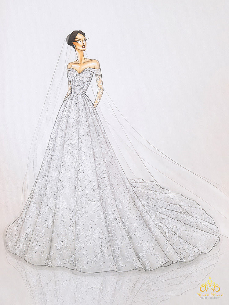 Đầu tiên, mỗi chiếc áo cưới trễ vai bespoke đều được thành hình từ bản phác thảo tuyệt đẹp và chi tiết nhất.