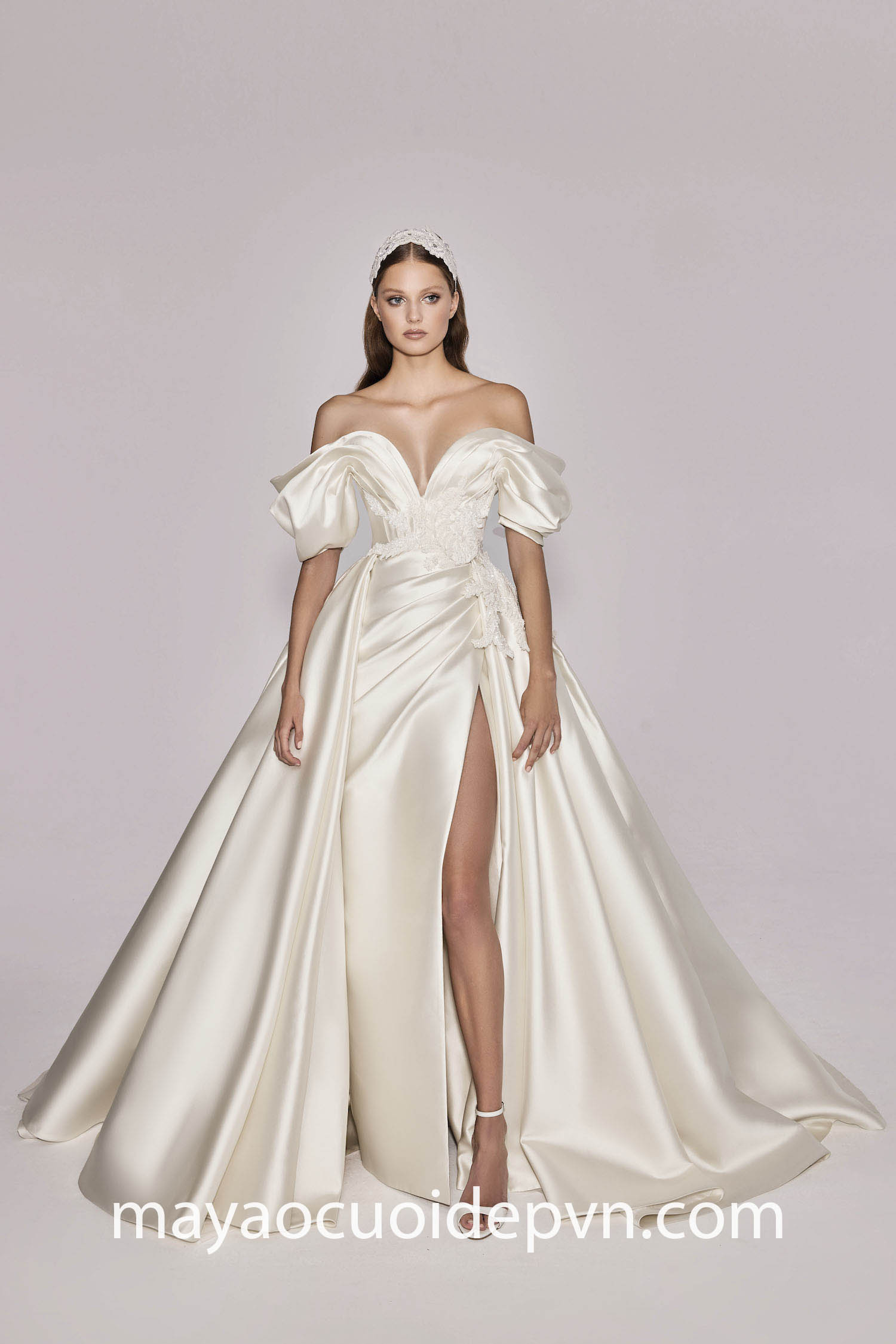 Cô dâu muốn hoá thân thành một nàng công chúa sành điệu hãy diện lên người mẫu váy cưới tay phồng xẻ tà. Thiết kế đặc sắc với phom váy thực hiện trên chất satin đứng phom, tạo hình tay áo sắc nét đi cùng đường xẻ tà giúp bạn dễ dàng di chuyển, đồng thời có thể khoe khéo đôi chân nuột nà.