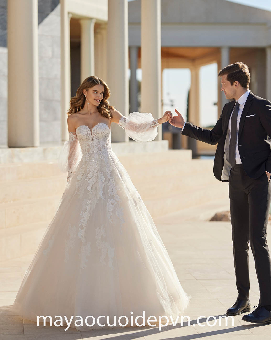 Hay bạn cũng có thể tối ưu hoá tiện ích với kiểu áo cưới tay phồng tháo rời, giúp bạn có thêm sự thay đổi trong phong cách với cùng một chiếc váy cưới: nổi bật khi làm lễ cùng kiểu áo tay phồng đặc sắc, duyên dáng quyến rũ cùng phom váy cúp ngực khi tham dự tiệc chiêu đãi vào buổi tối.