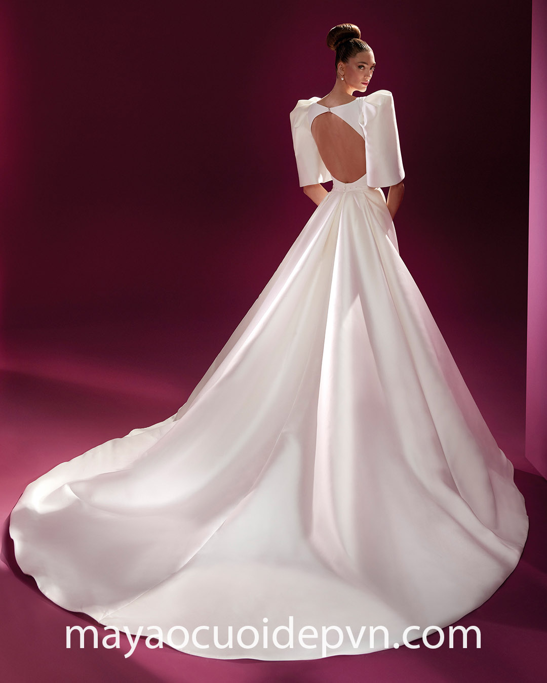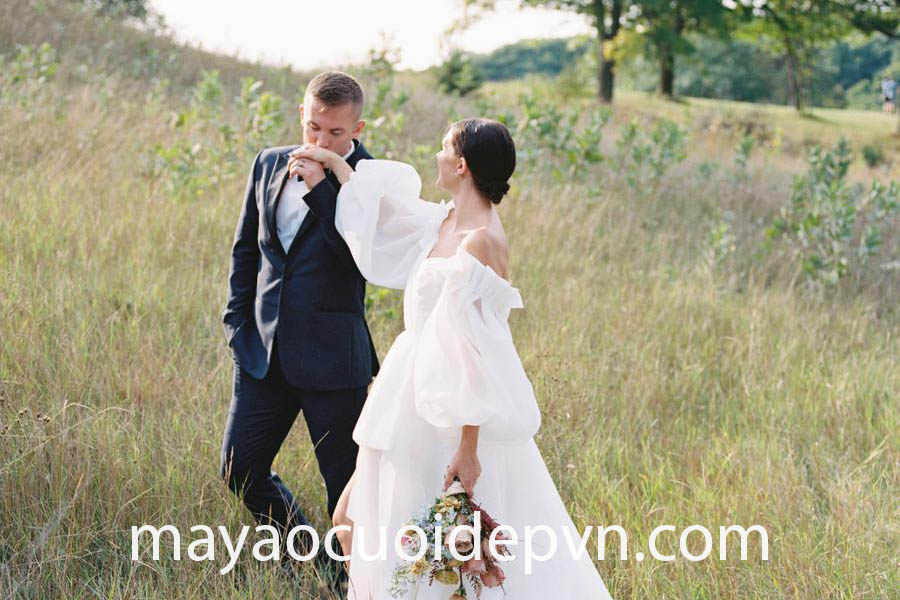 Chi tiết tay phồng dễ dàng thu hút sự chú ý, tạo nên điểm nhấn đắt giá cho bộ trang phục cưới của bạn. Đặc biệt, bạn cũng có thể thoả sức sáng tạo kiểu áo khi lựa chọn đặt may áo cưới thiết kế riêng cho mình.