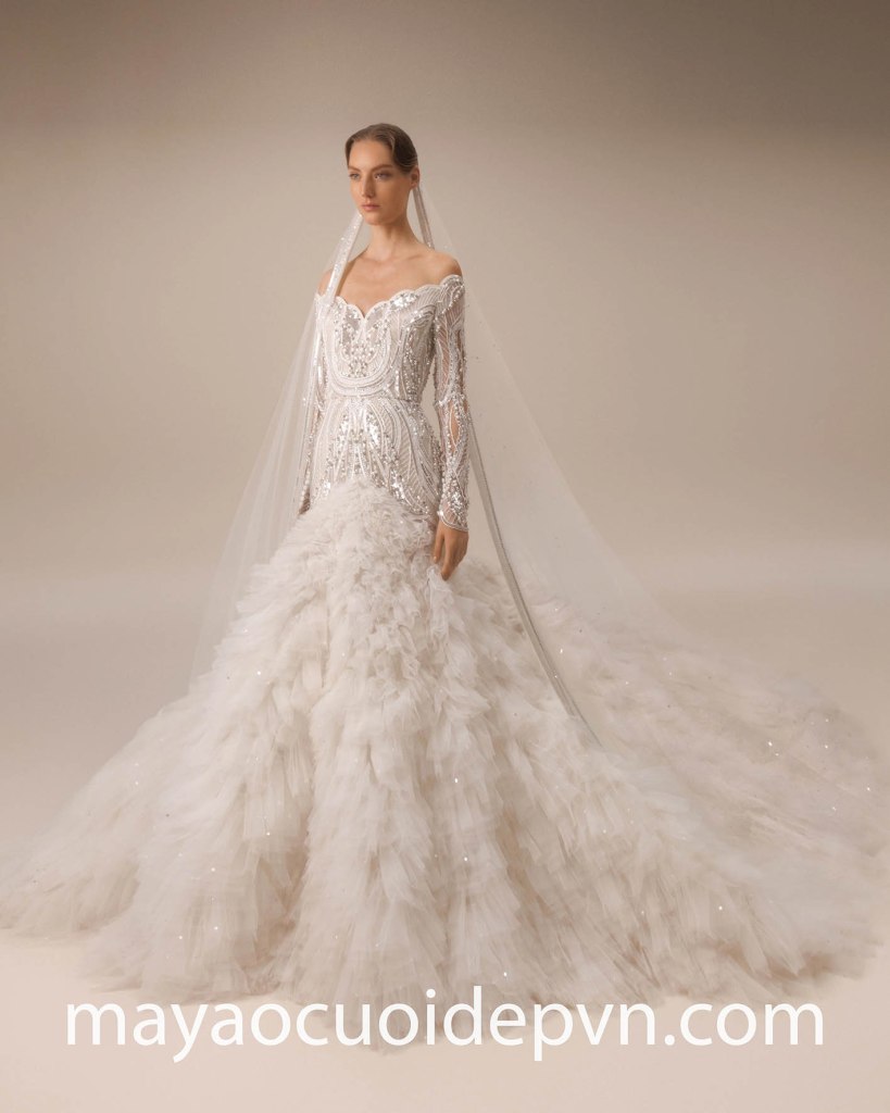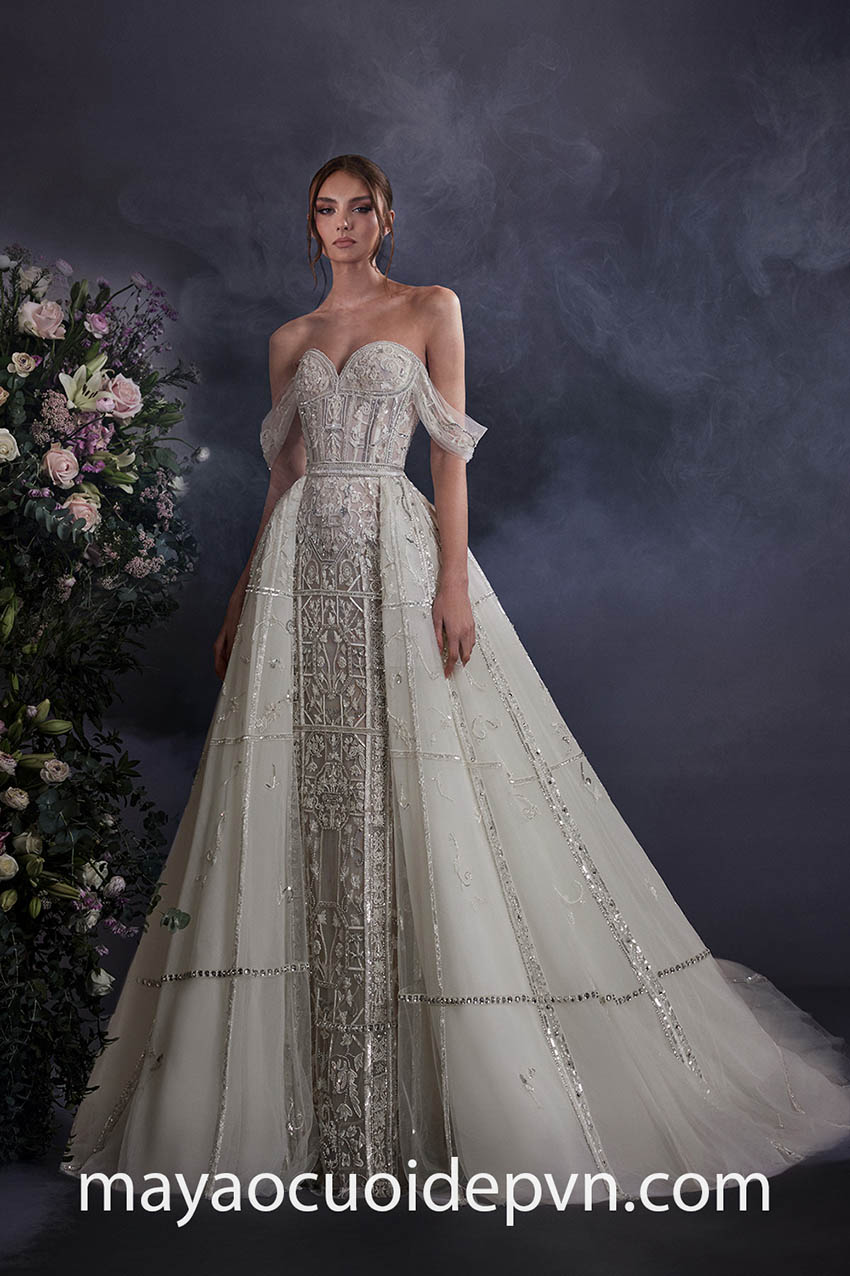 Bạn là một cô dâu có tư duy đổi mới và phong cách thời trang vượt trội? Tác phẩm áo cưới Couture xếp bèo tầng nhà Meera Meera sẽ mang đến cho bạn những trải nghiệm vượt xa mọi quy chuẩn. Thiết kế mang đậm dấu ấn cá nhân với tạo hình bất đối xứng lạ mắt, thân áo cúp ngực corset tôn vinh đường cong tự nhiên của cơ thể, kết hợp cùng nghệ thuật trang trí độc bản trên nền lưới siêu nhẹ. Một tác phẩm nghệ thuật đặc sắc lưu truyền dấu ấn của bạn mãi về sau.