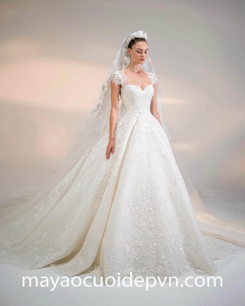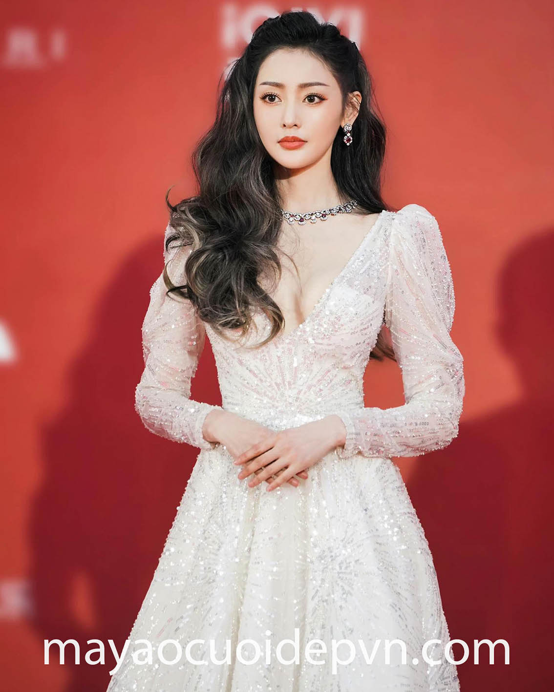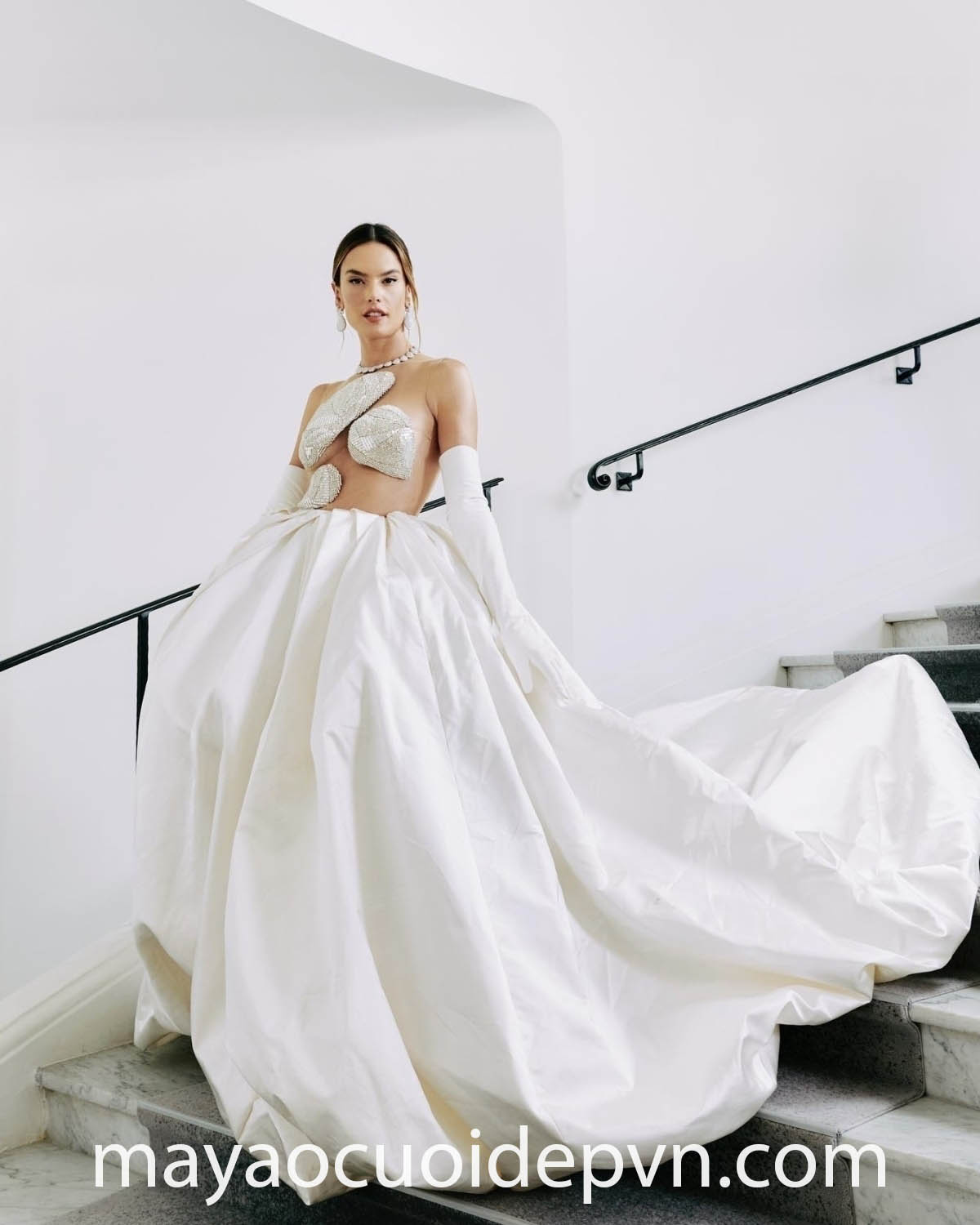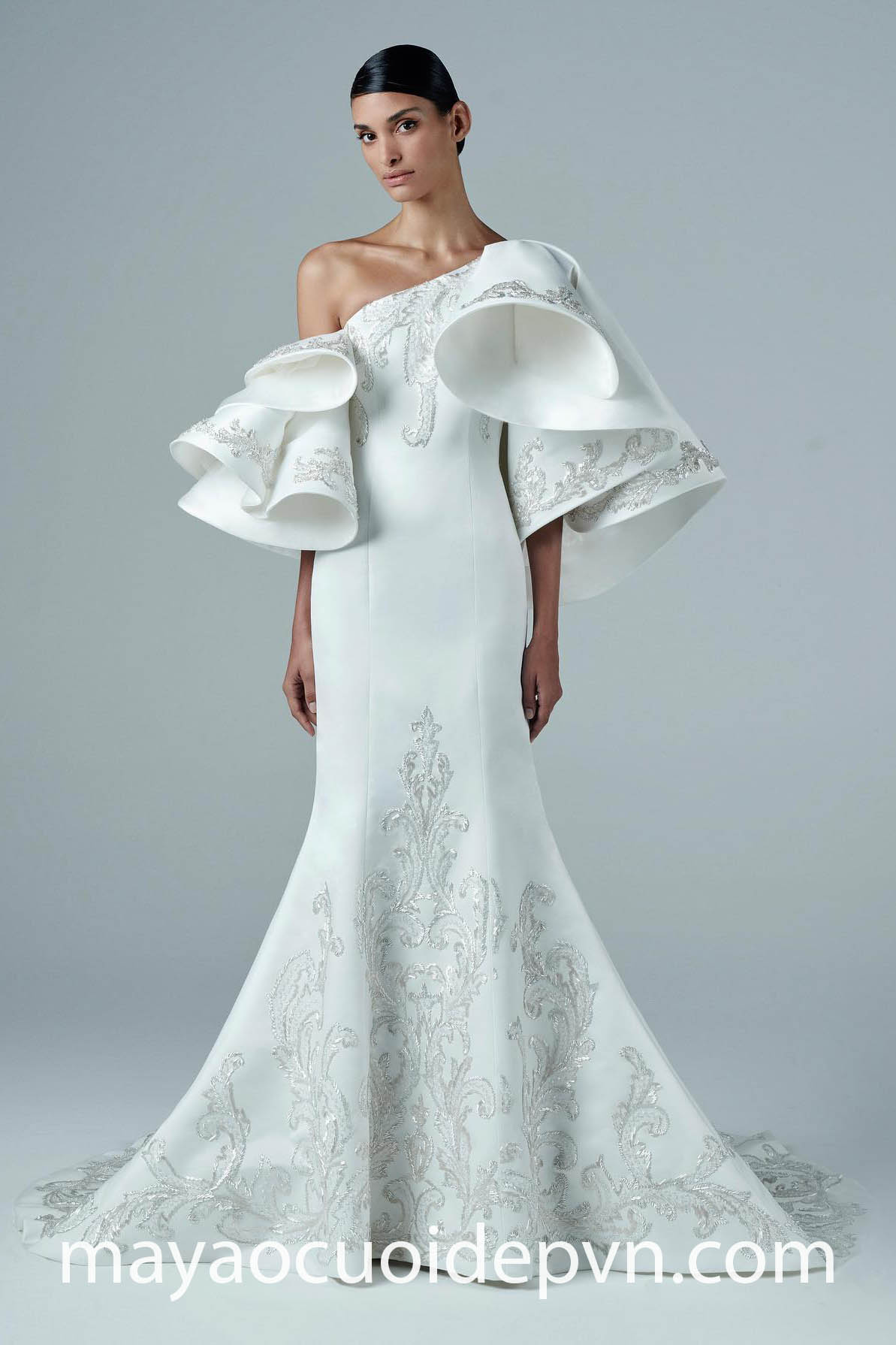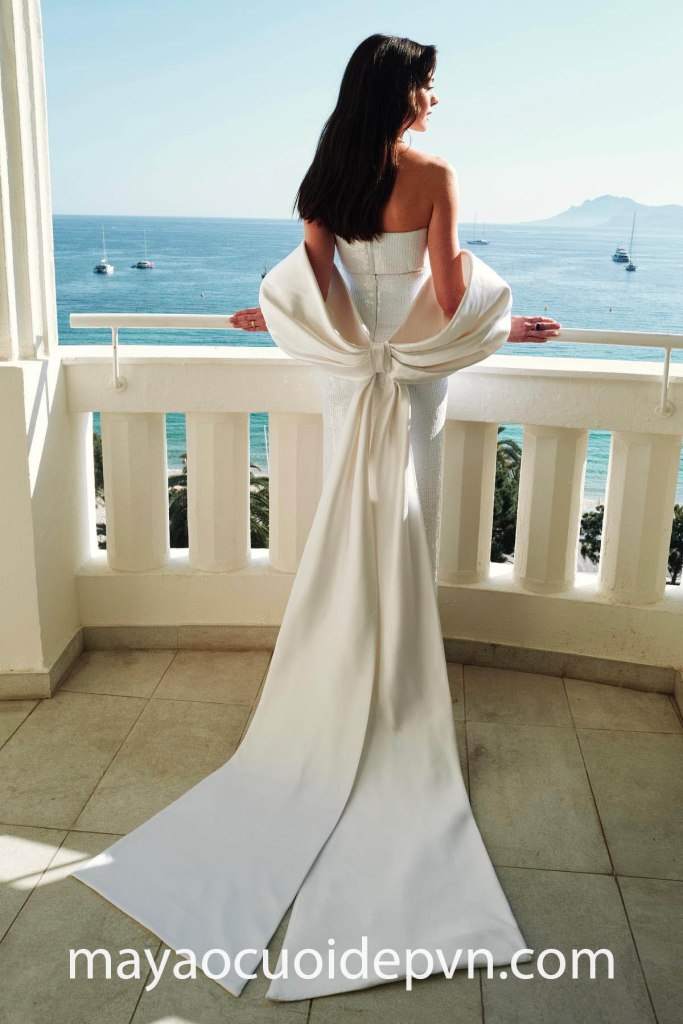 Bên cạnh đó, kiểu áo cưới dạ hội tay choàng cape cũng là lựa chọn tiêu biểu mang đậm dấu ấn thảm đỏ của các mỹ nhân hàng đầu Thế giới. Chi tiết tay áo quý phái gợi nhớ đến phong cách thời trang thanh lịch, trang trọng và vô cùng lôi cuốn của các nữ quý tộc xưa.