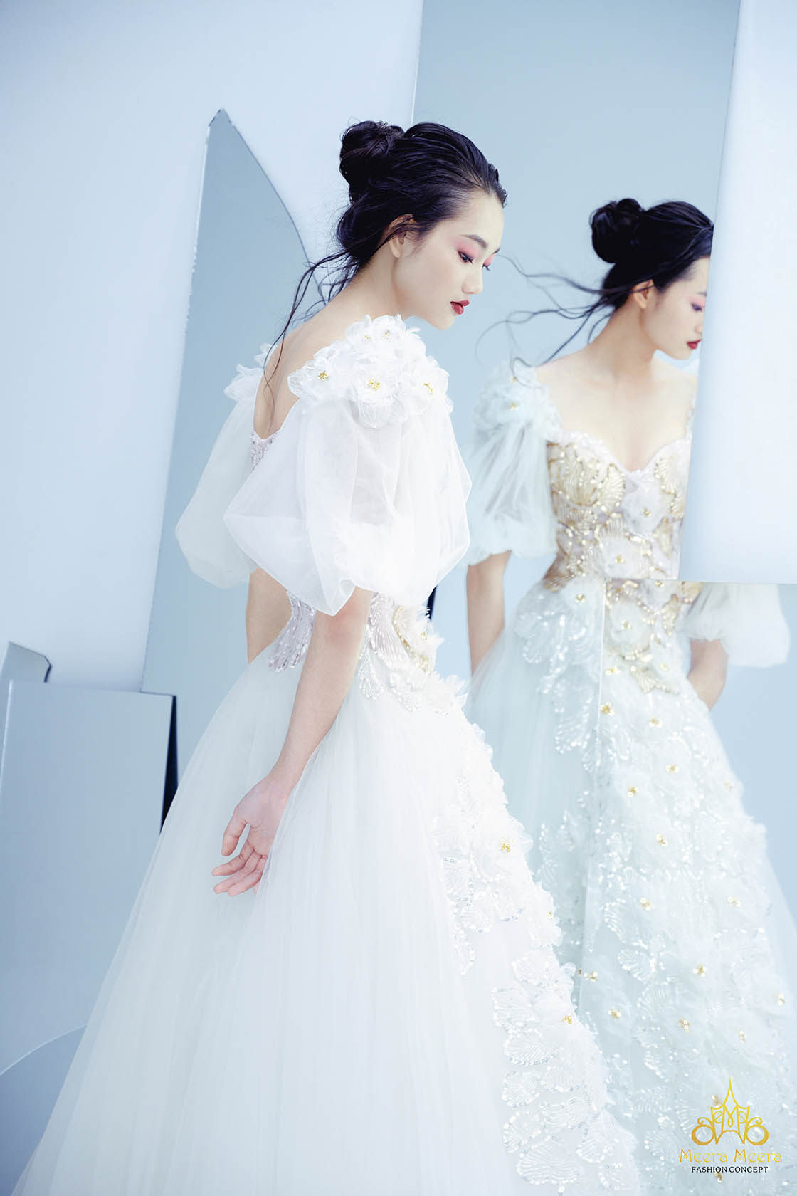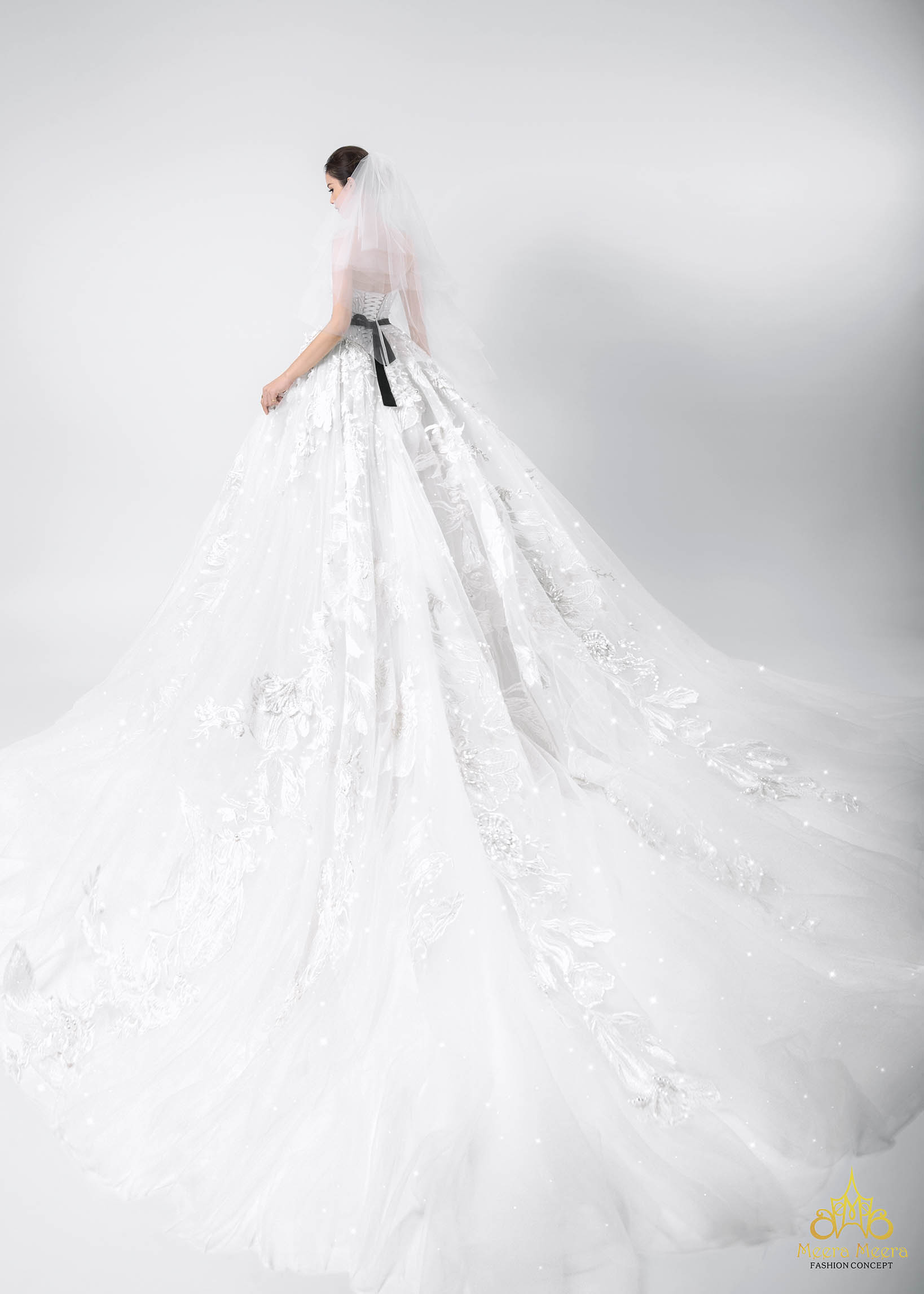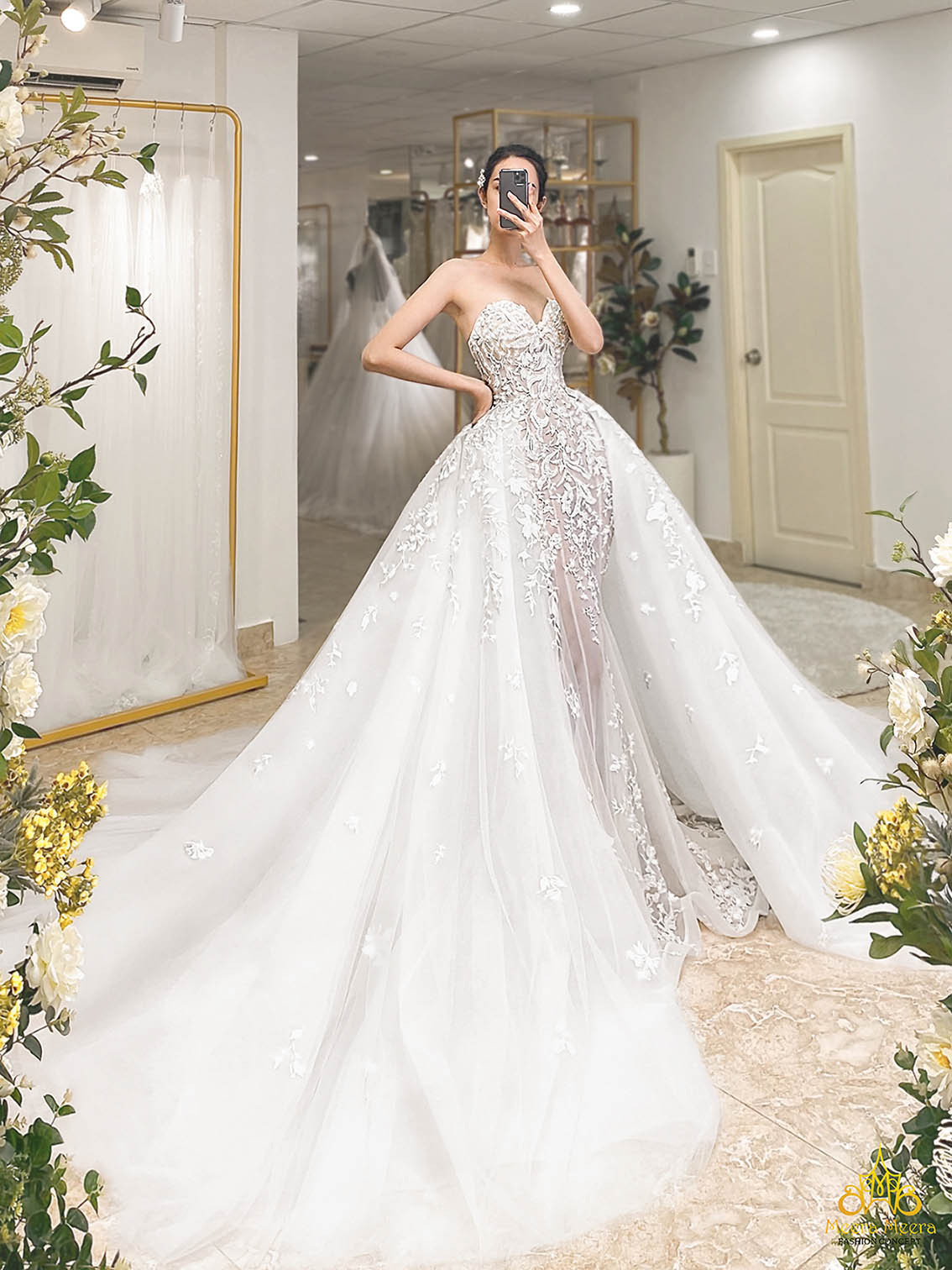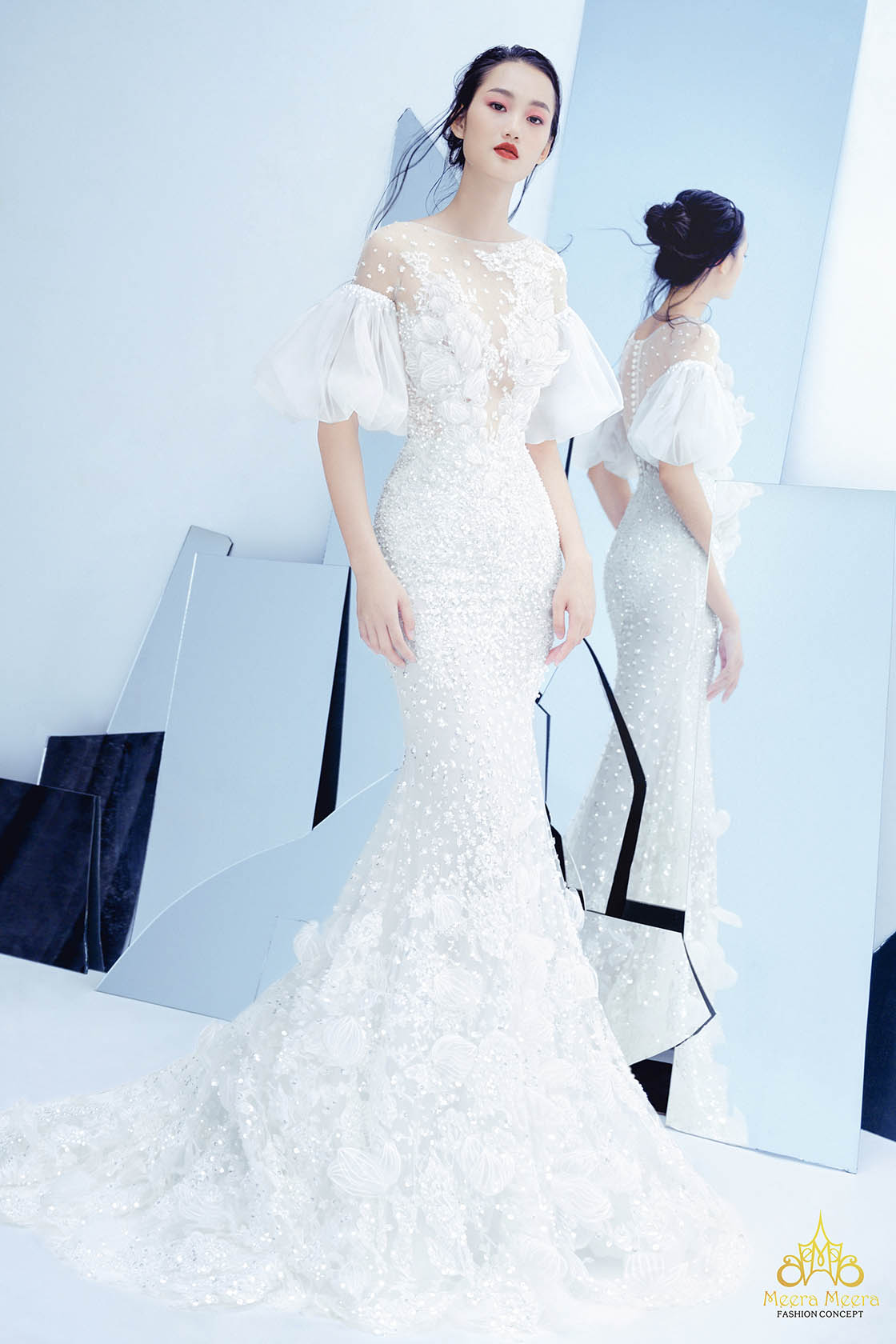Tác phẩm váy cưới đuôi cá 2 trong 1 nhà Meera Meera được sáng tạo dành cho những cô dâu mong ước hoá thân thành Nữ thần trong ngày trọng đại. Đầm cưới đuôi cá xuyên thấu hoàn toàn với hệ thống corset tôn vinh hoàn hảo đường cong đồng hồ cát, toàn bộ váy được phục sức lộng lẫy với chi tiết đính kết ren tinh xảo, kết hợp cùng tùng váy lưới có thể tháo rời để tăng thêm vẻ hào nhoáng cho hai kiểu váy trong cùng một chiếc áo cưới.