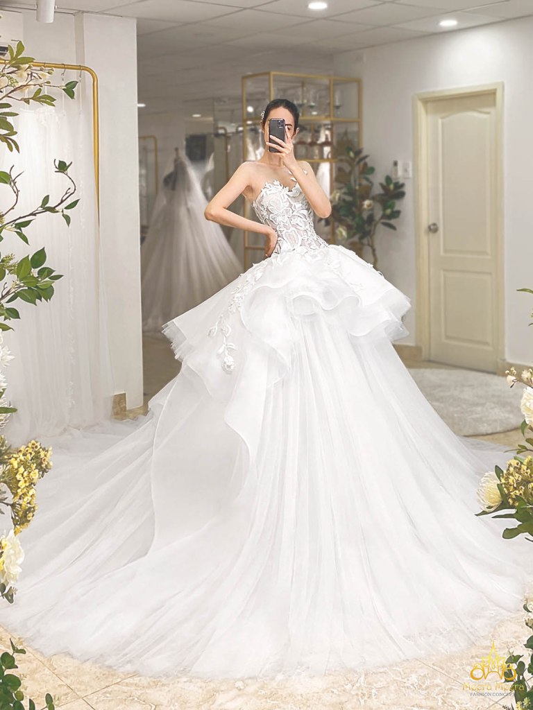 Vẻ ngoài hào nhoáng đậm chất vương giả của một nàng công chúa ngoài đời thật đã được Meera Meera truyền tải chân thực vào tác phẩm áo cưới công chúa xếp bèo tầng vô cùng ấn tượng. Mẫu thiết kế tôn dáng hoàn hảo với hệ thống corset đặt ẩn giúp siết eo nâng ngực tối đa, kết hợp đính kết trang trí tinh xảo cùng chi tiết hạ eo giúp kéo dài thân người và tạo điểm nhấn bằng thắt lưng mini tinh tế. Toàn thể khách mời sẽ không khỏi choáng ngợp trước vẻ đẹp kinh diễm của cô dâu với tùng váy xoè hoành tráng, được kiến tạo từ hàng trăm nghìn mảnh vải xếp bèo tầng vô cùng công phu và khéo léo. Một hành trình tuyệt vời tạo nên khoảnh khắc đáng giá nhất mà bất kỳ cô gái nào cũng đều ao ước.
