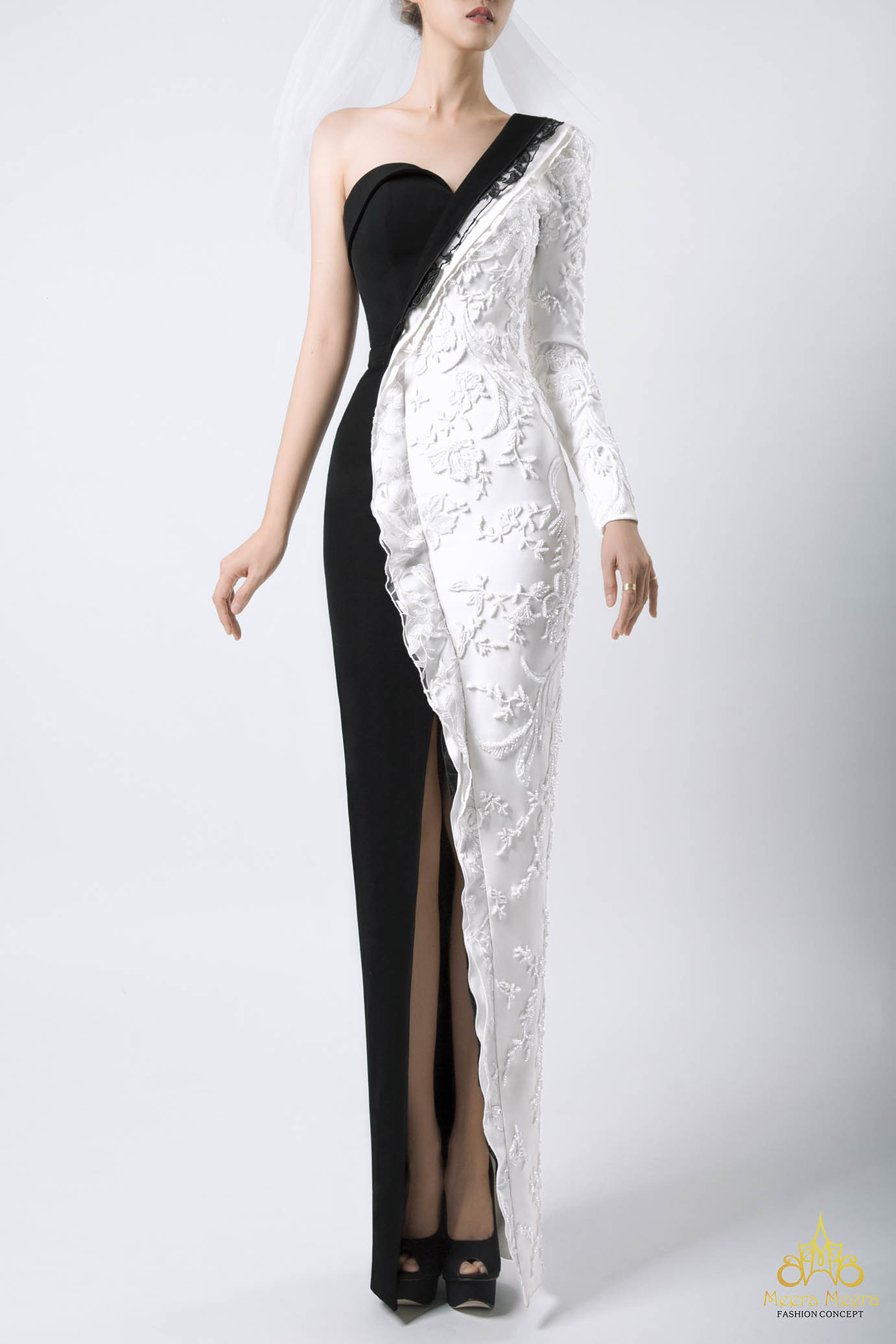 Tác phẩm áo cưới hai màu trắng đen nhà Meera Meera là một ý tưởng độc đáo dành riêng cho quý cô thành đạt yêu thời trang. Phom váy được cắt may sắc nét trên nền chất liệu đặc biệt, yêu chiều đường cong ngọc ngà của cô dâu. Thiết kế bất đối xứng nổi bật với hai màu trắng và đen, cùng chi tiết cắt xẻ táo bạo tạo hiệu ứng tương phản mạnh mẽ, tất cả tạo nên vẻ ngoài độc nhất dành cho cô dâu mong muốn diện lên người chiếc váy cưới xứng tầm đẳng cấp vượt trội.