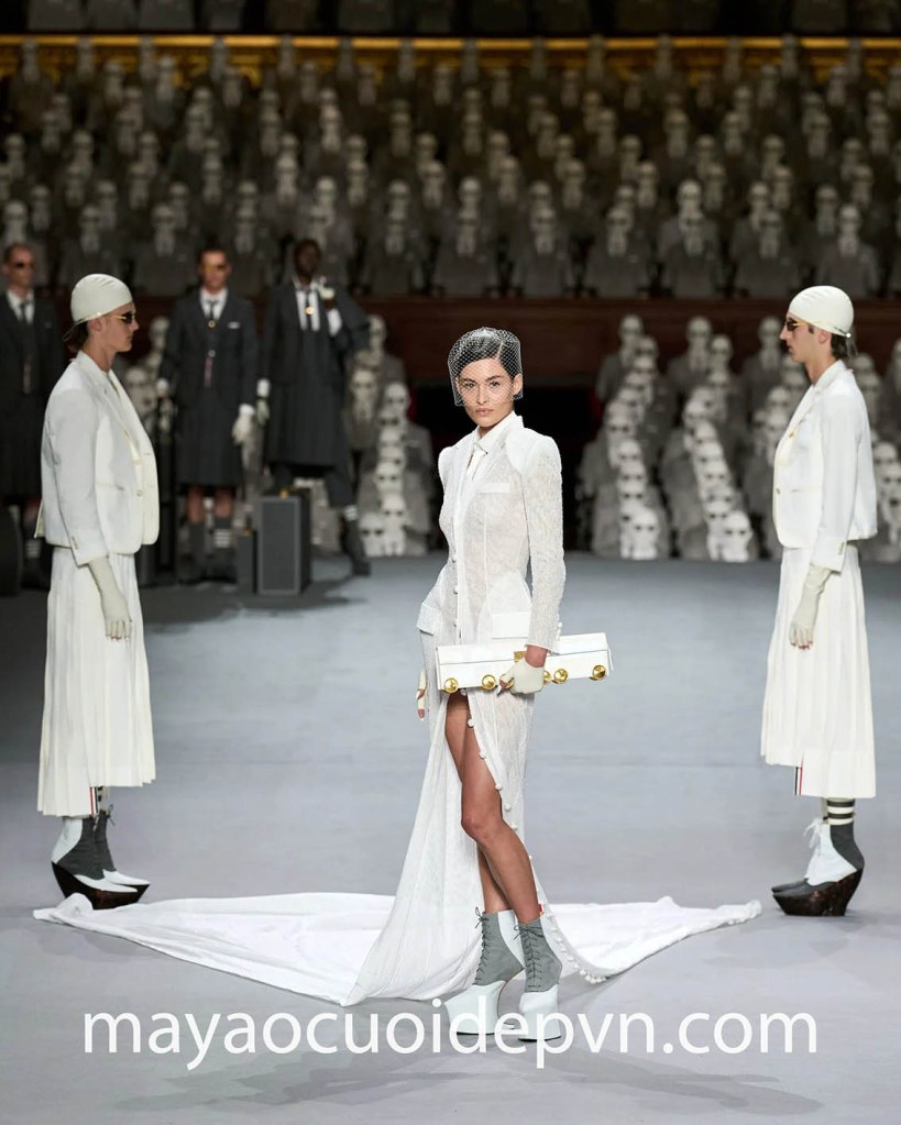 Để kết thúc show diễn vô cùng ấn tượng năm nay, nhà mốt Thom Browne gửi đến cô dâu tương lai mẫu áo cưới vest đầy phá cách. Đường cong quyến rũ ẩn hiện cùng chất vải bán xuyên thấu, nổi bật với cổ áo vest cùng tay áo dài độn vai đầy nữ quyền, đi cùng chân váy đắp tà điểm nút và kết thúc hoành tráng bằng đuôi dài quét đất.