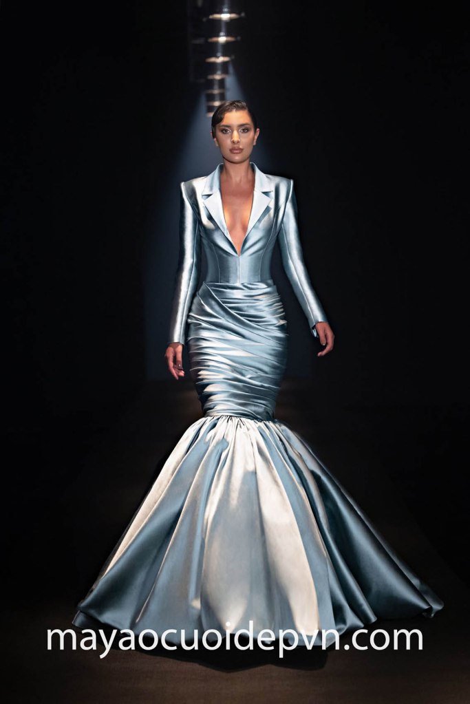 Nhà mốt Rami Kadi mang đến cho cô dâu thời thượng một mẫu váy cưới đuôi cá cổ vest đầy quyền lực, nổi bật với cổ áo xẻ sâu sexy đối lập cùng tay áo dài trang trọng, thân áo corset tôn dáng đi cùng những đường xếp li đầy mê hoặc, giúp cô dâu chiếm trọn spotlight trong ngày cưới.