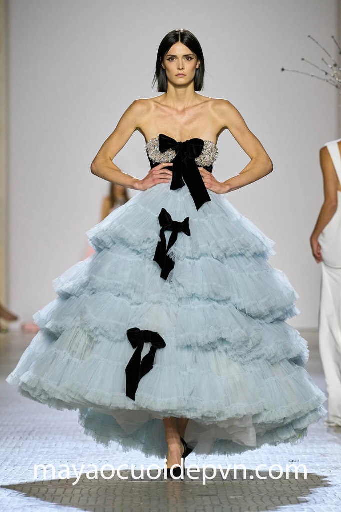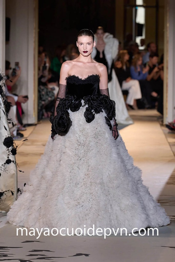Trong khi đó, nhà mốt lừng danh Giambattista Valli giới thiệu đến các cô dâu những mẫu đầm cưới hai màu trắng đen vừa bí ẩn lại vô cùng sang trọng và lộng lẫy. Nổi bật với cổ áo mở vai gợi cảm, tùng váy lụa là xếp li nữ tính; hay phom dáng công chúa xoè mộng mơ phối cùng tay áo phồng đài cát, kiêu sa.
