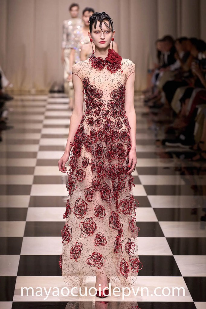 Nhà mốt danh giá Armani Privé mang đến đẳng cấp vượt bậc cho quý cô dâu thời thượng, trong bộ áo cưới Haute Couture đính kết hoa đỏ bắt mắt trên nền vải xuyên thấu vừa gợi cảm lại vô cùng sang trọng.