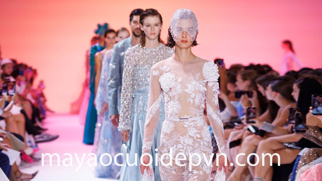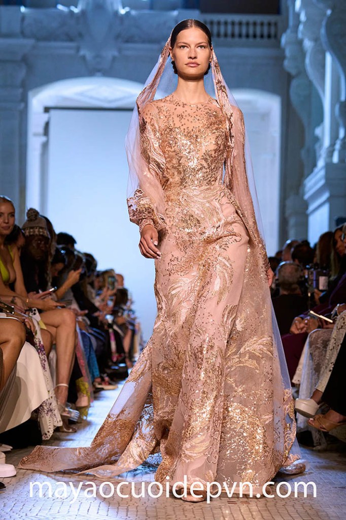 Thương hiệu nổi tiếng bậc nhất xứ Trung Đông – Elie Saab tiếp tục “hớp hồn” giới mộ điệu với hàng loạt thiết kế Haute Couture đậm chất vương giả. Trong đó nổi bậc nhất với những mẫu váy cưới Couture màu da phối khăn trùm đầu lạ mắt, hay như mẫu đầm cưới công chúa Haute Couture đính kết ánh vàng đồng thật tinh xảo.