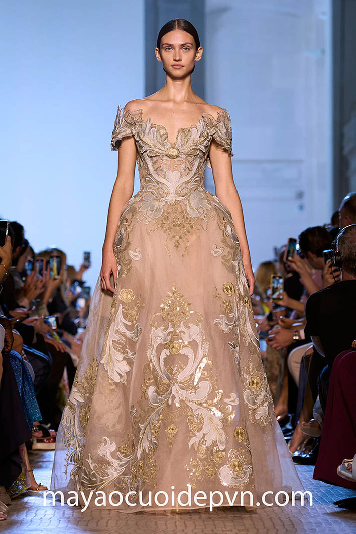Thương hiệu nổi tiếng bậc nhất xứ Trung Đông – Elie Saab tiếp tục “hớp hồn” giới mộ điệu với hàng loạt thiết kế Haute Couture đậm chất vương giả. Trong đó nổi bậc nhất với những mẫu váy cưới Couture màu da phối khăn trùm đầu lạ mắt, hay như mẫu đầm cưới công chúa Haute Couture đính kết ánh vàng đồng thật tinh xảo.