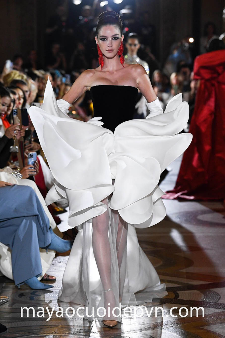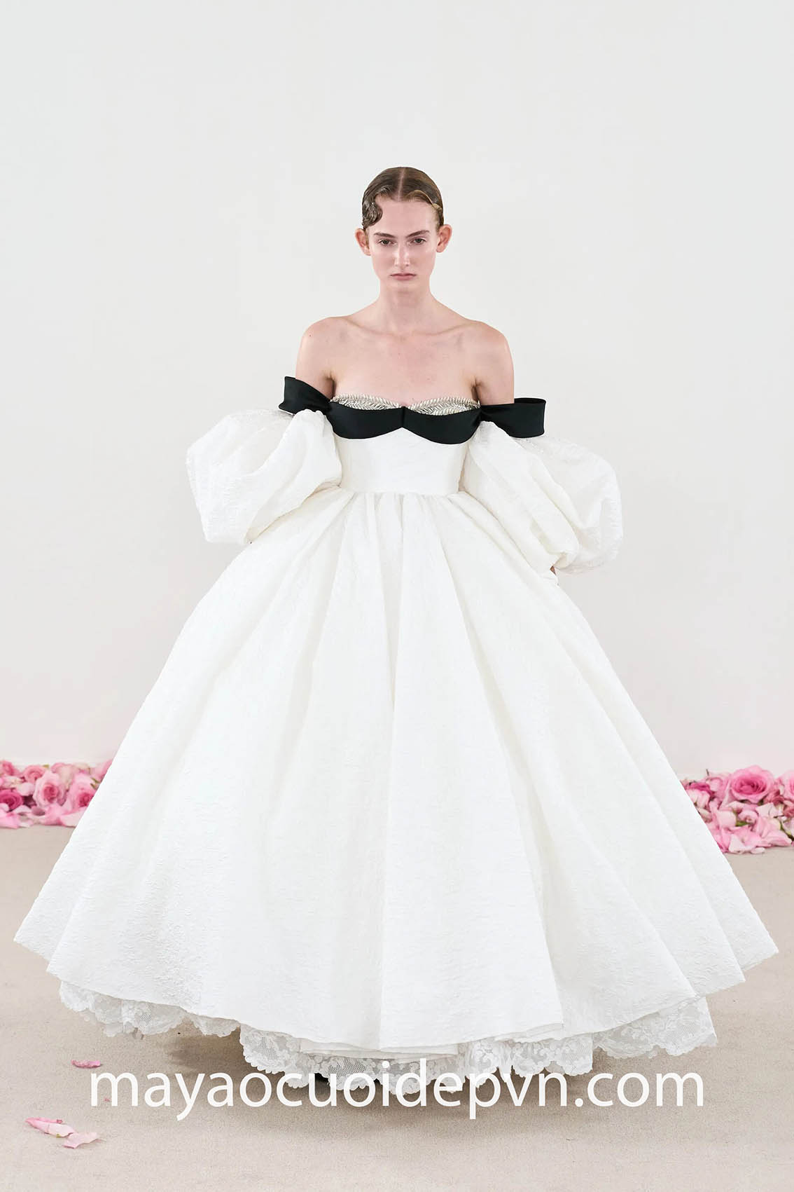 Trong khi đó, nhà mốt lừng danh Giambattista Valli giới thiệu đến các cô dâu những mẫu đầm cưới hai màu trắng đen vừa bí ẩn lại vô cùng sang trọng và lộng lẫy. Nổi bật với cổ áo mở vai gợi cảm, tùng váy lụa là xếp li nữ tính; hay phom dáng công chúa xoè mộng mơ phối cùng tay áo phồng đài cát, kiêu sa.