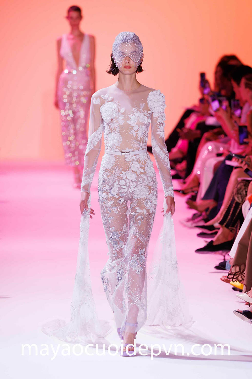 Thương hiệu thời trang Georges Hobeika mang đến mùa Haute Couture Fall Winter 2023 những thiết kế vô cùng táo bạo và gợi cảm. Có thể kể đến chiếc váy cưới xuyên thấu hoàn toàn phơi bày đường cong địa đàng của cô dâu, kết hợp nghệ thuật trang trí ren được đính kết đặc sắc. Hay như mẫu đầm cưới xẻ tà cut-out đầy táo bạo, mang đến cho cô dâu vẻ ngoài lộng lẫy như một Nữ thần.