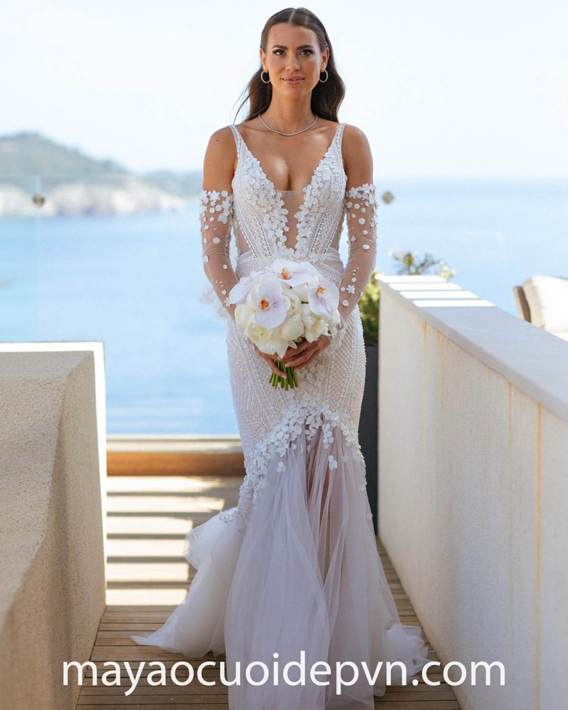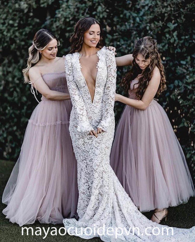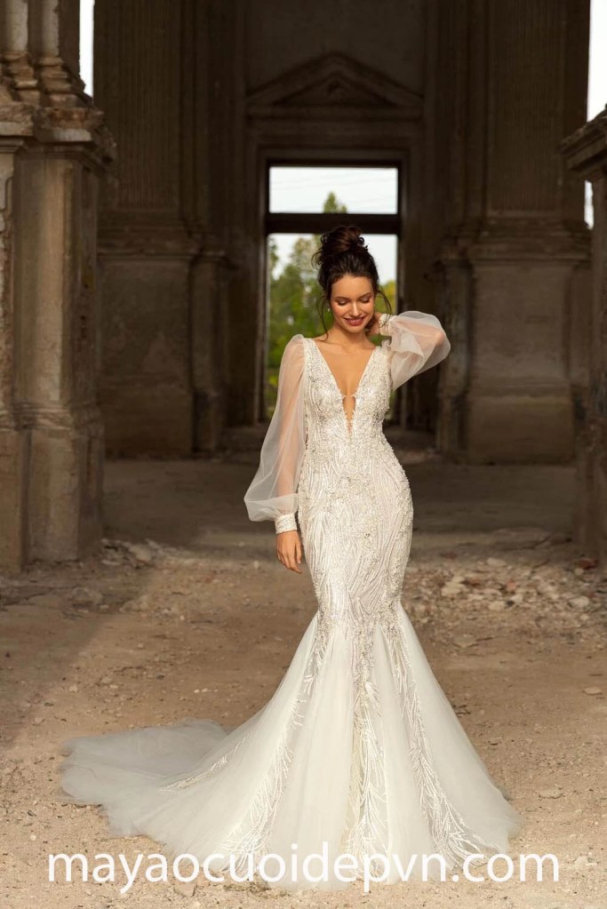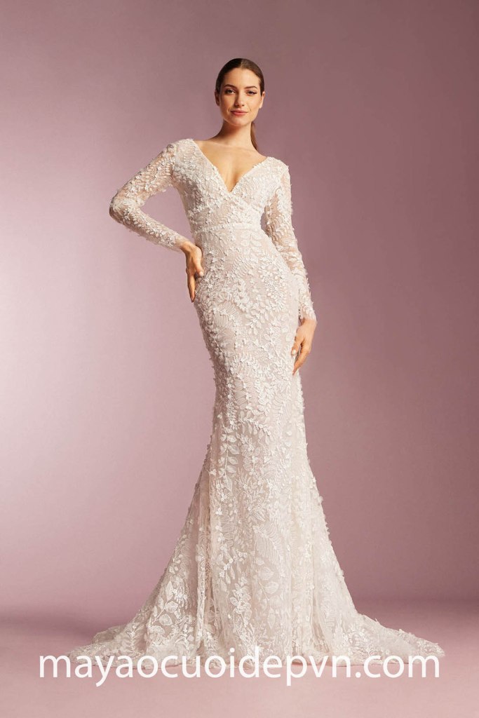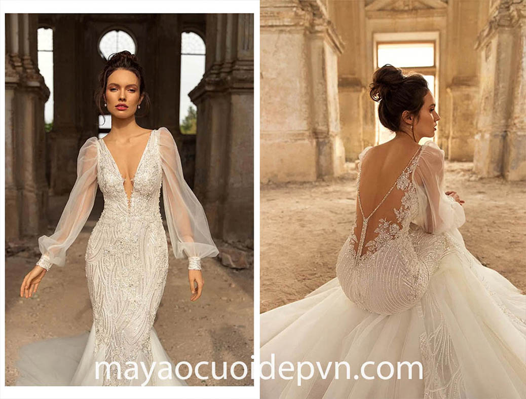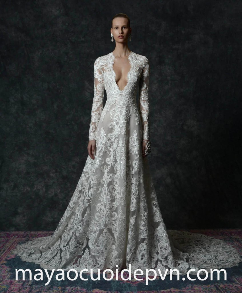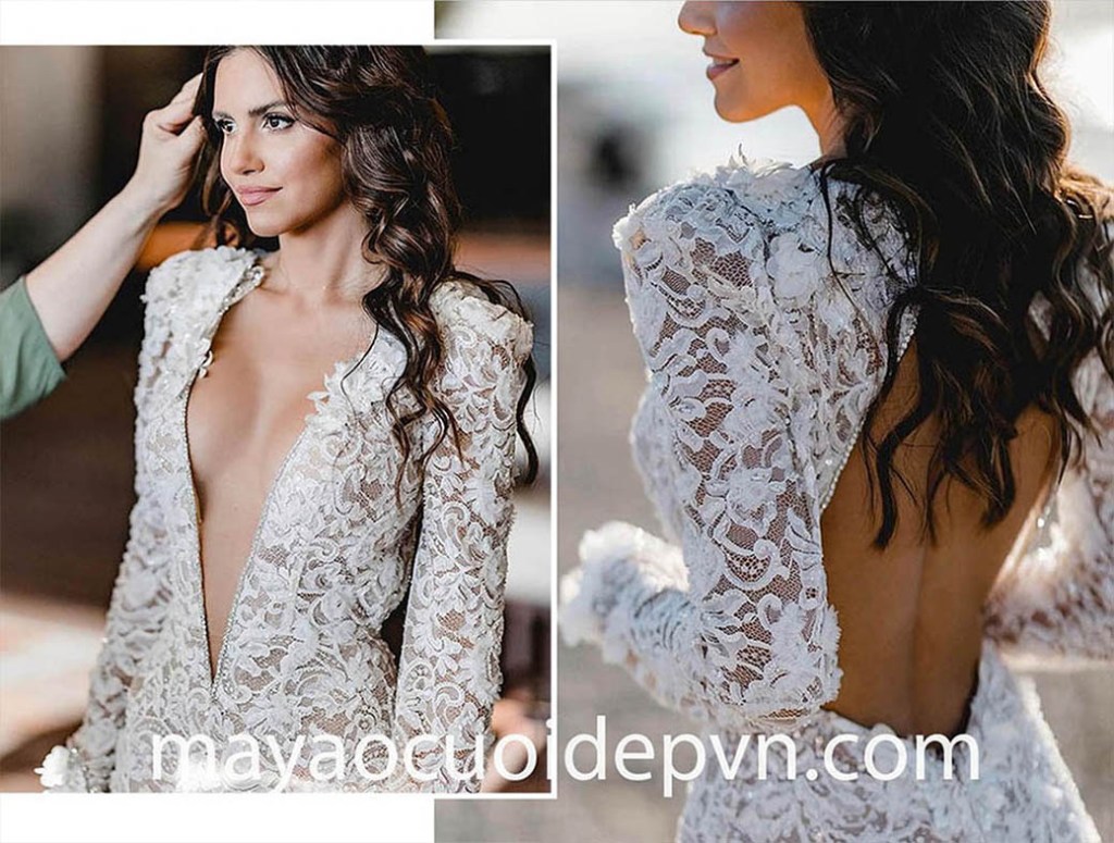 VÁY CƯỚI CỔ V XẺ SÂU TAY DÀI