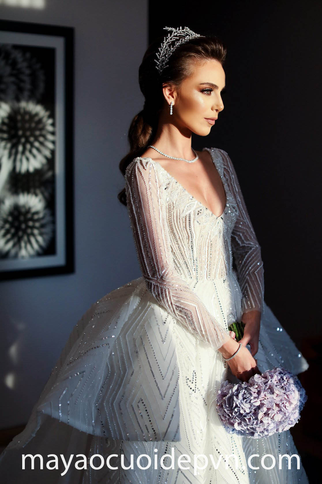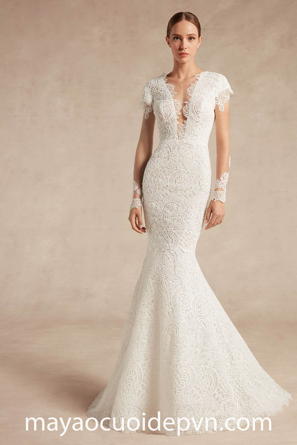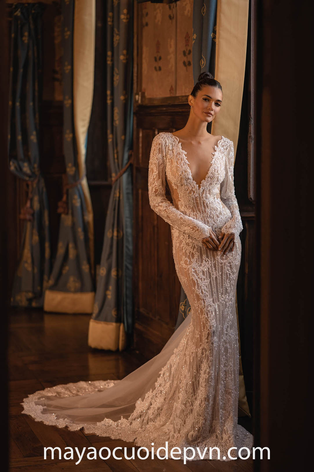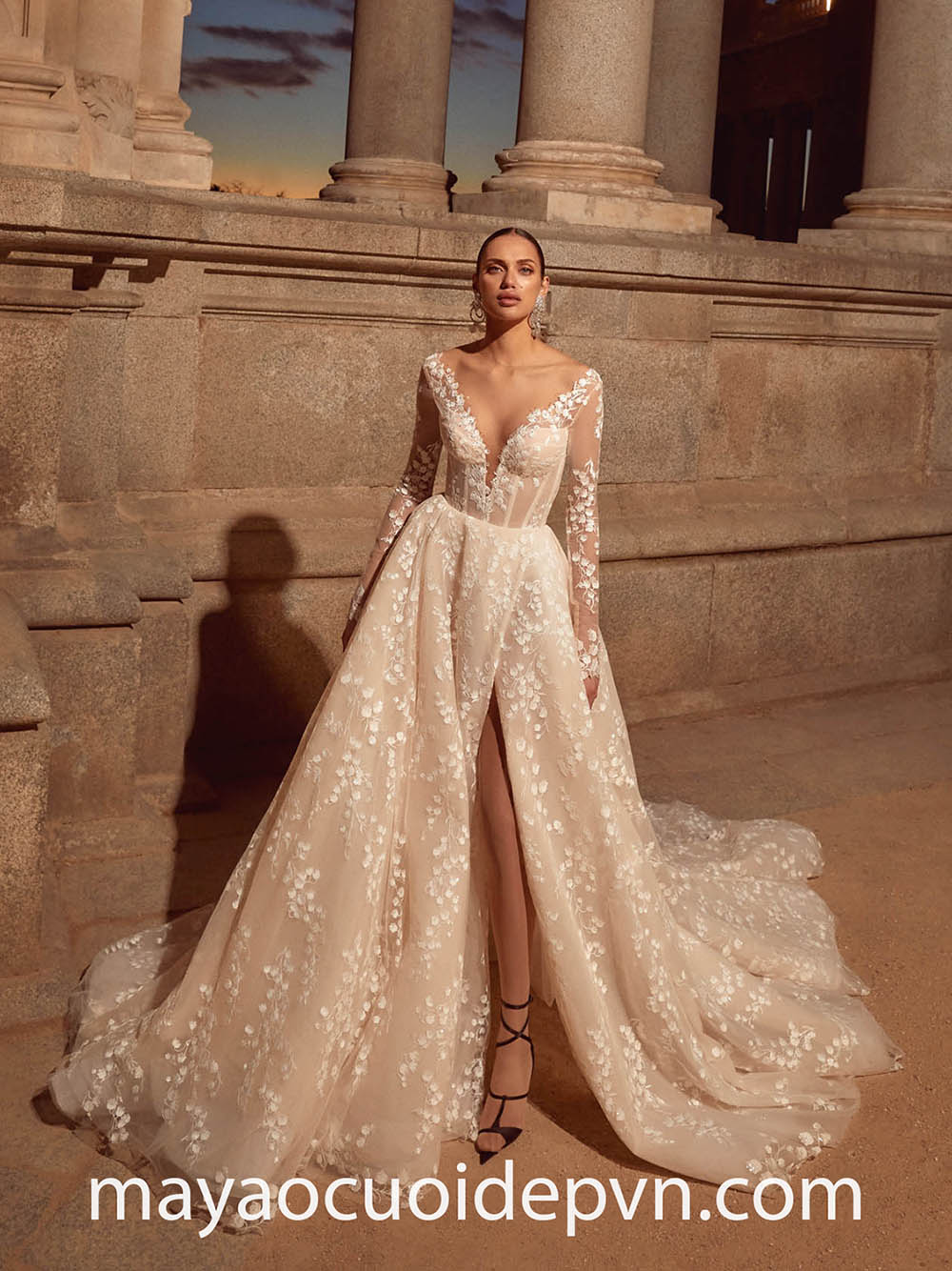 VÁY CƯỚI CỔ V XẺ SÂU TAY DÀI