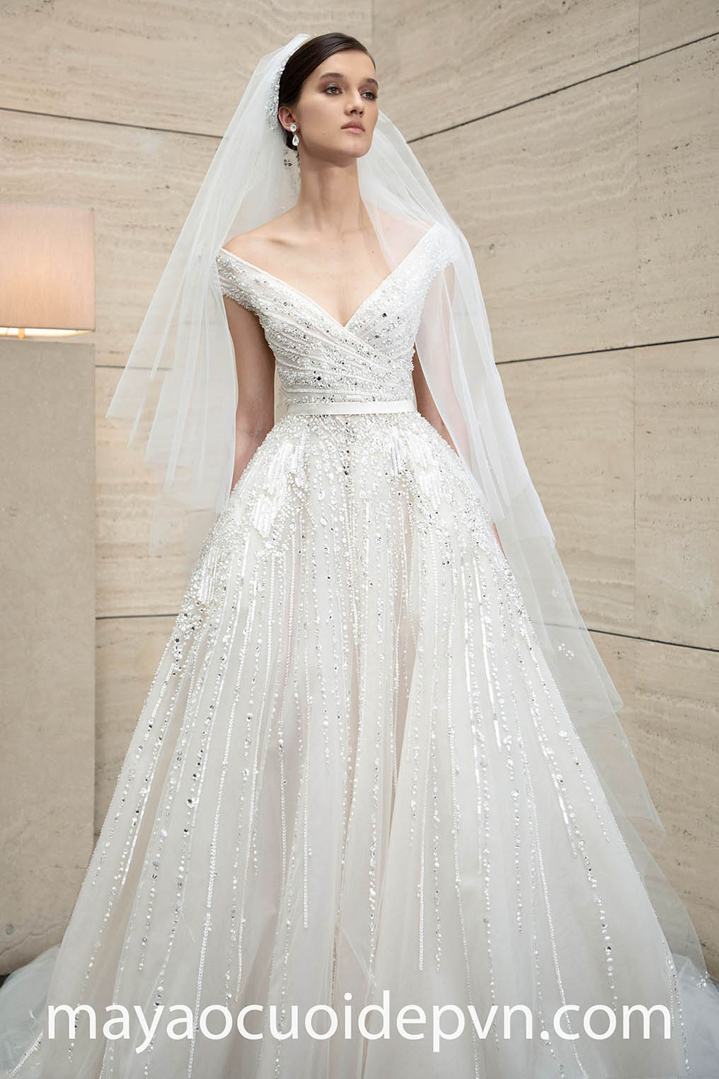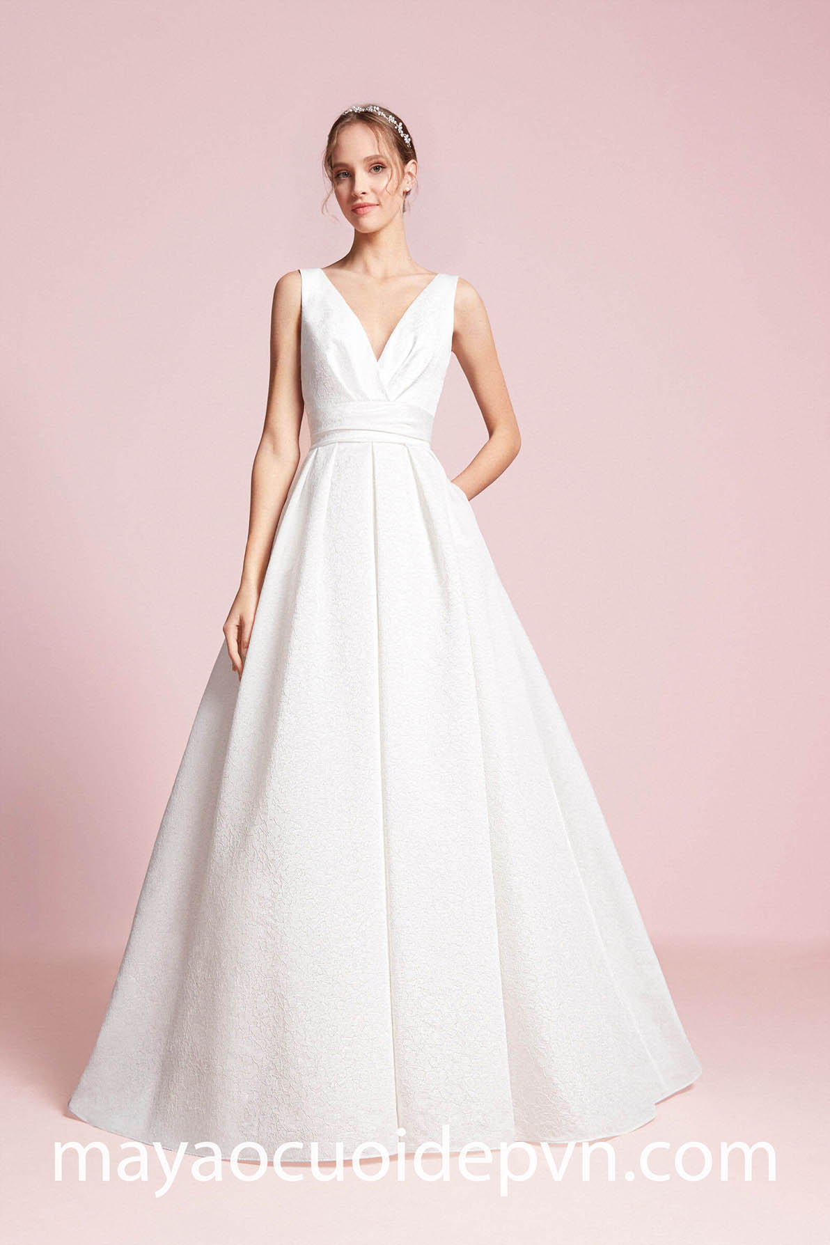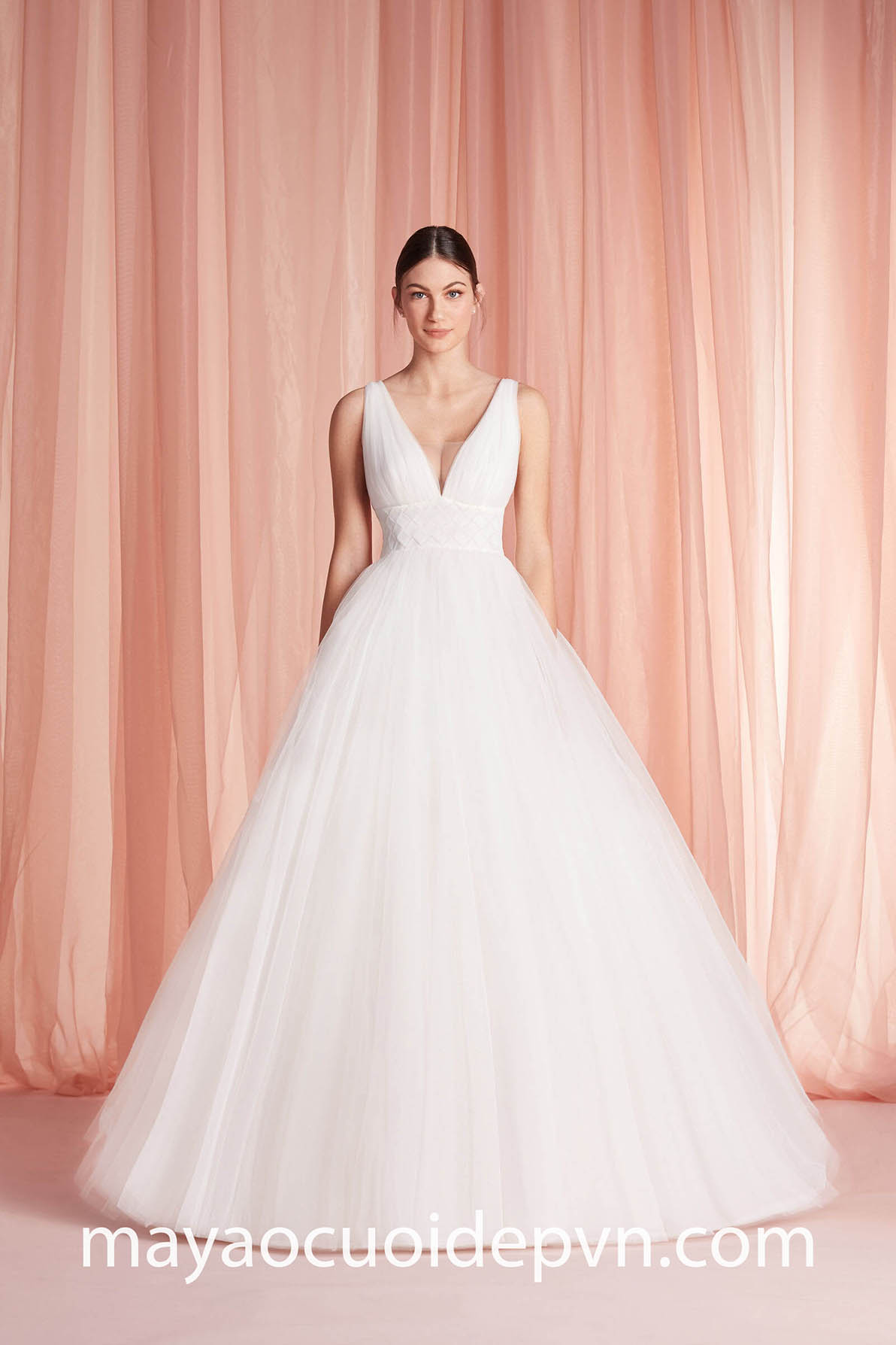 ĐẦM CƯỚI CỔ V TAY PHỒNG