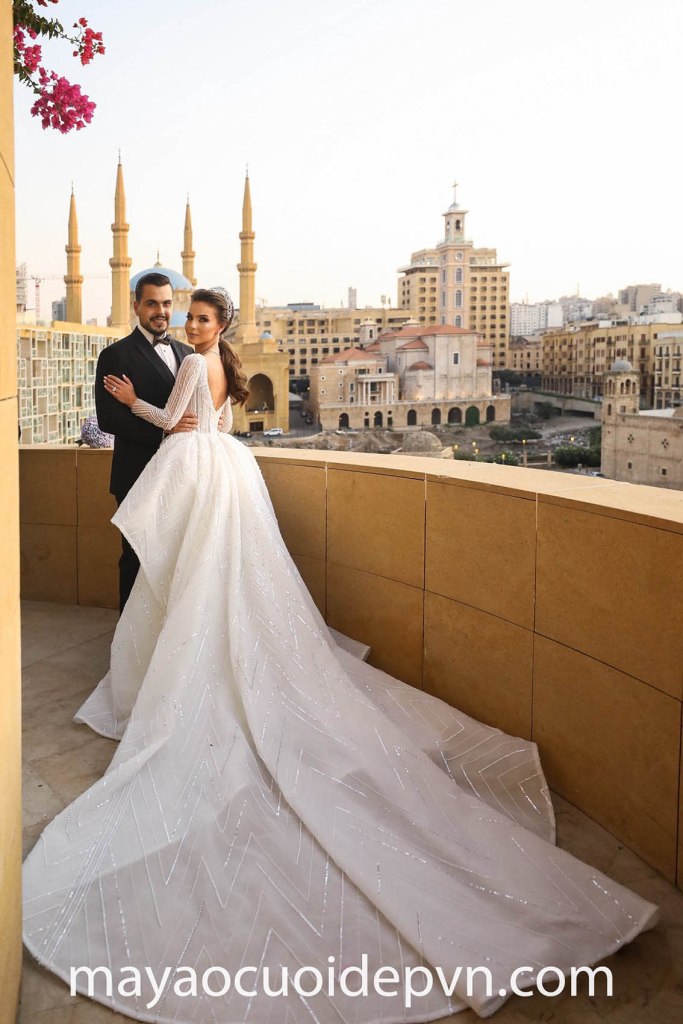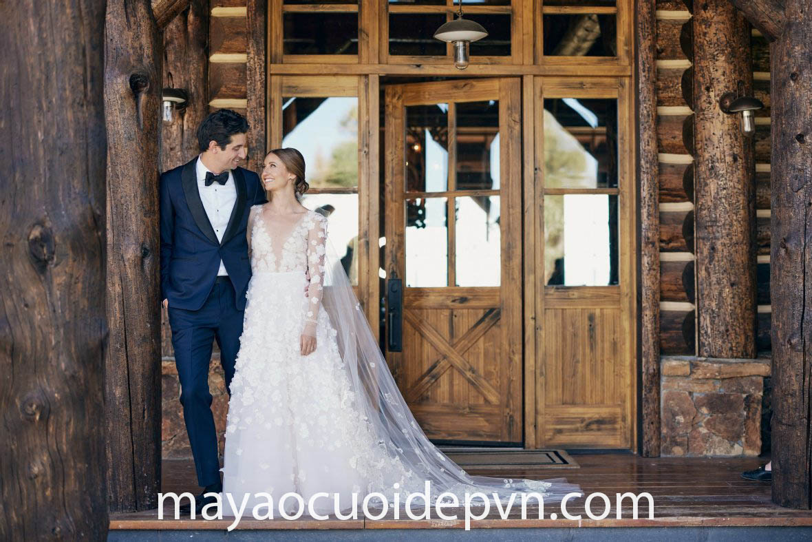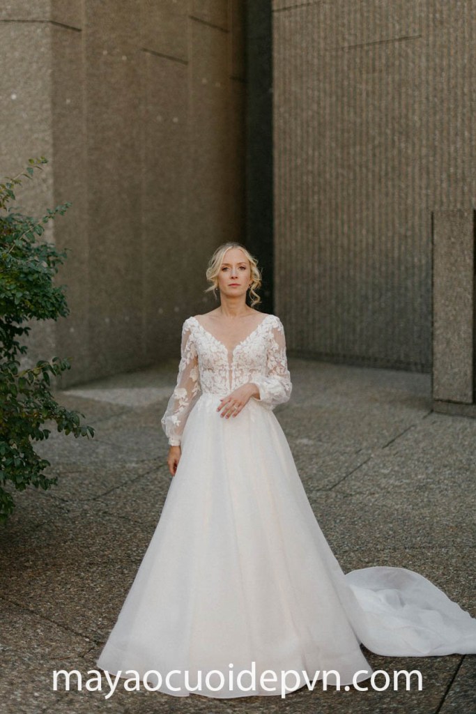 Bạn là một quý cô thời thượng đang mong muốn sở hữu một vẻ ngoài thật gợi cảm nhưng vẫn phảng phất nét thanh lịch duyên dáng – Đầm cưới cổ V sâu tay dài là một kết hợp vô cùng thú vị giữa kiểu cổ áo xẻ ngực sâu táo bạo, phối với tay áo dài vừa trang trọng lại góp phần gia tăng thêm vẻ lộng lẫy cho hình ảnh của một cô dâu sành điệu.