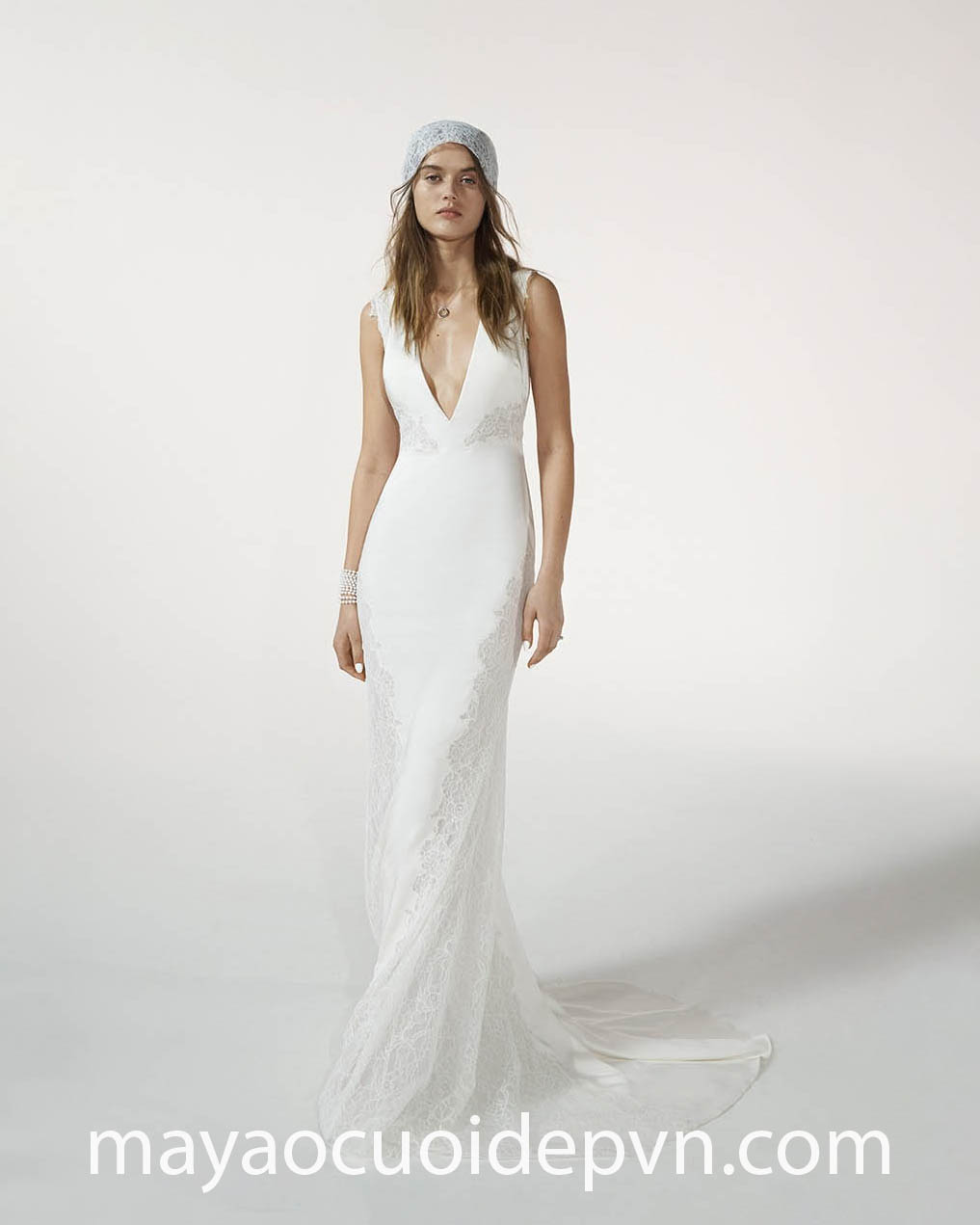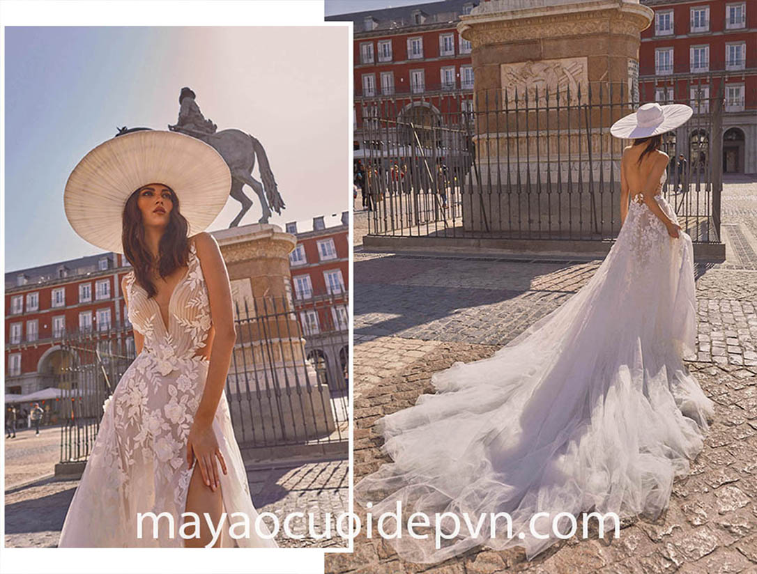 VÁY CƯỚI CỔ V XẺ TÀ CAO