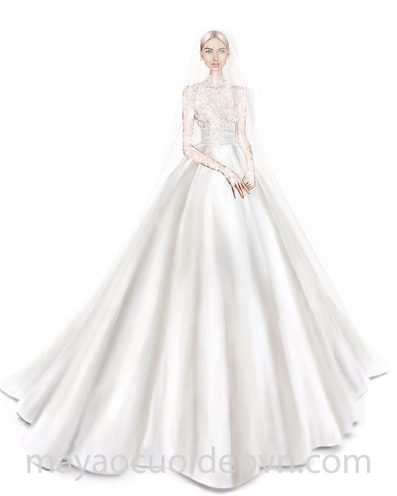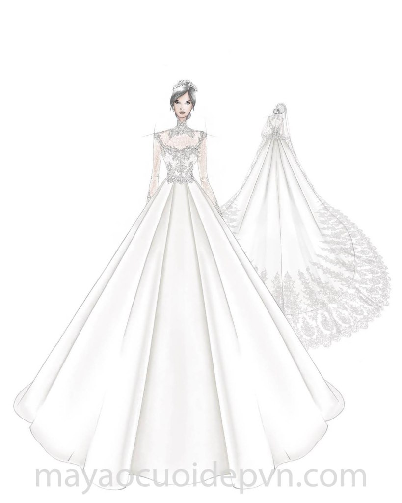 Bắt đầu từ giấc mơ và mong muốn của từng cô dâu, mỗi chiếc váy cưới cổ cao bespoke đều được hình thành từ bản vẽ phác thảo chi tiết nhất.